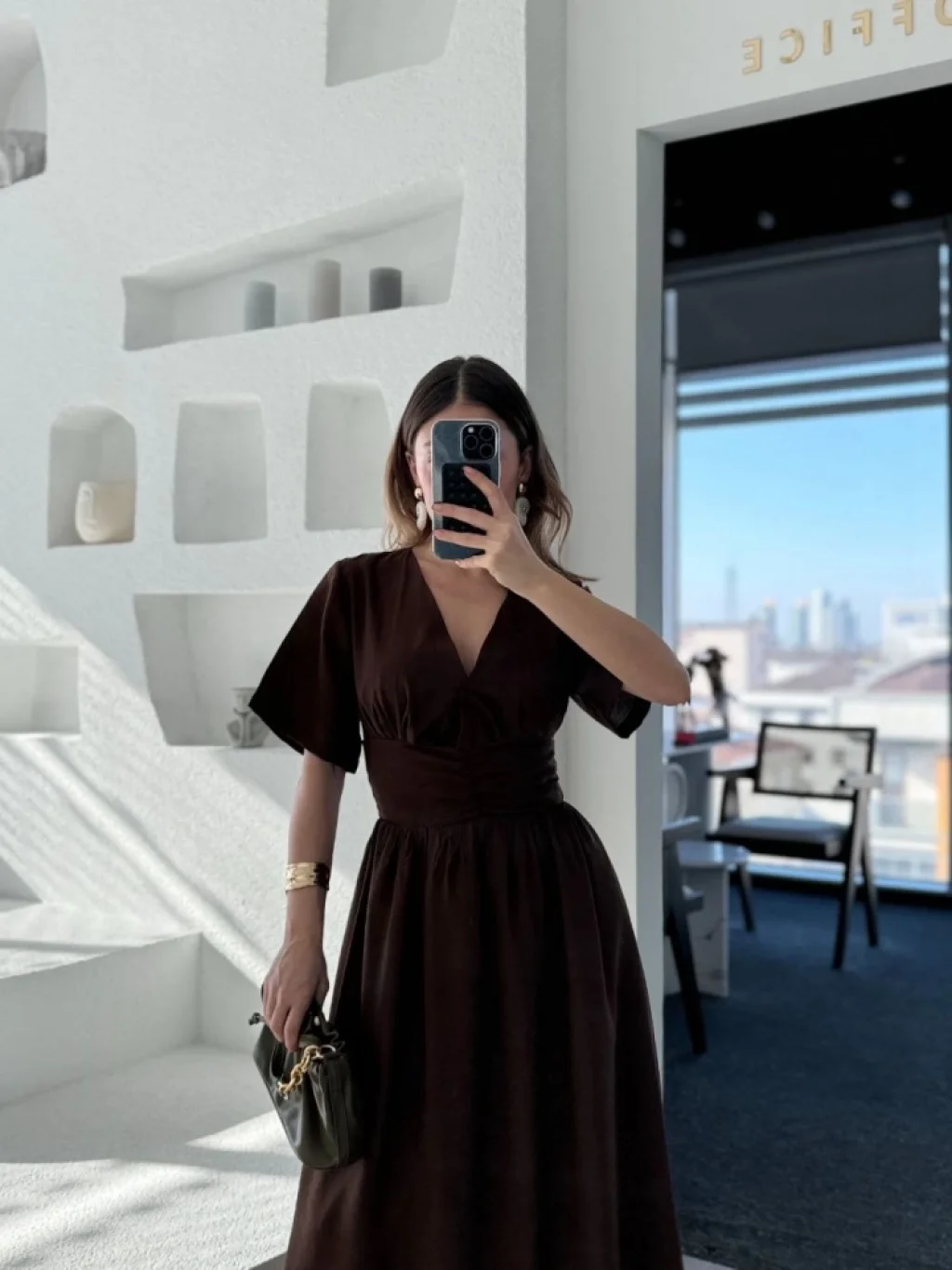 <p>Kısa Kollu Uzun Elbise - Kahve</p><br> <p>Modelin Ölçüleri: Boy:165, Kg:55, Göğüs:90, Bel:72, Kalça: 100</p><br> <p>Modelin üzerindeki ürün M/38 bedendir</p><br> <ul> </ul>