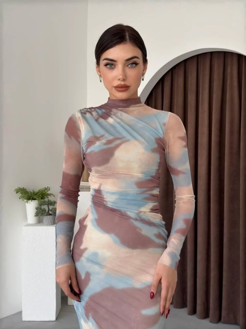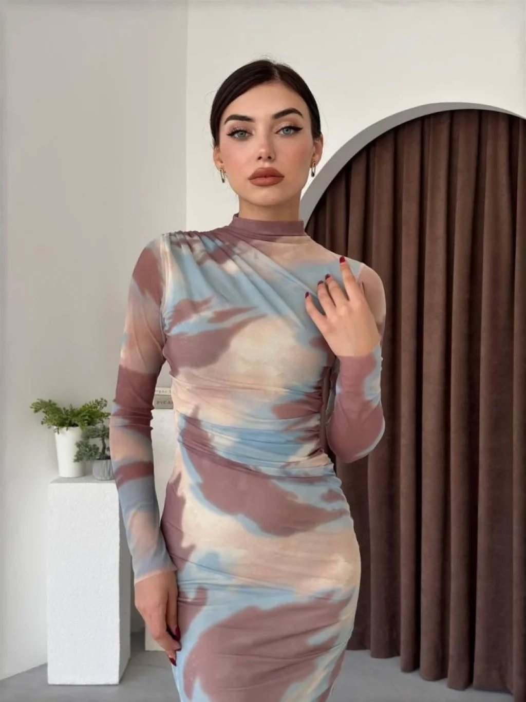 Kadın Uzun Kollu Yakalı Yandan Bağlamalı Mini Desenli Modal Elbise