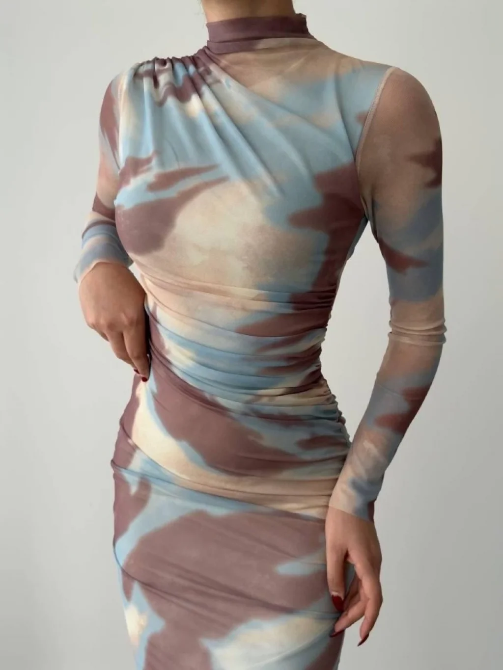 Kadın Uzun Kollu Geometrik Yaka Midi Ithal Krep Elbise