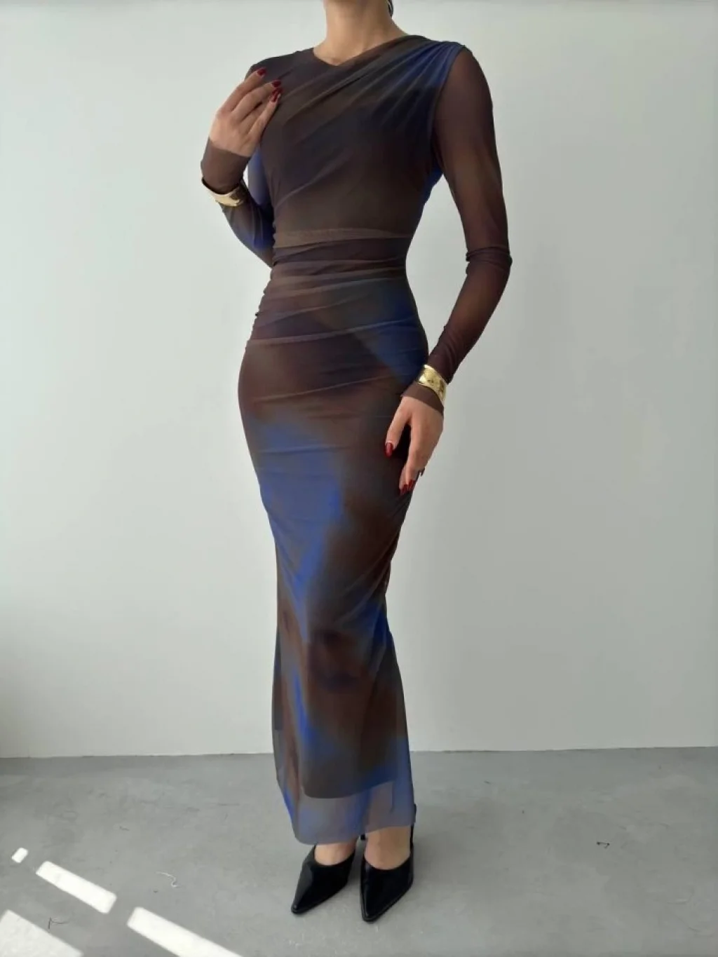Kadın Uzun Kollu Kruvaze Yakalı Desenli Süprem Maxi Elbise