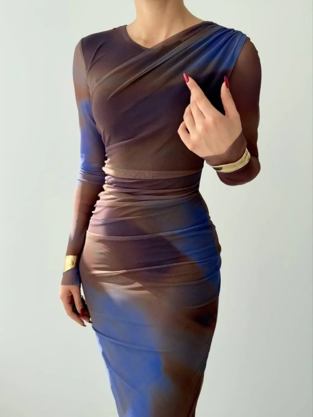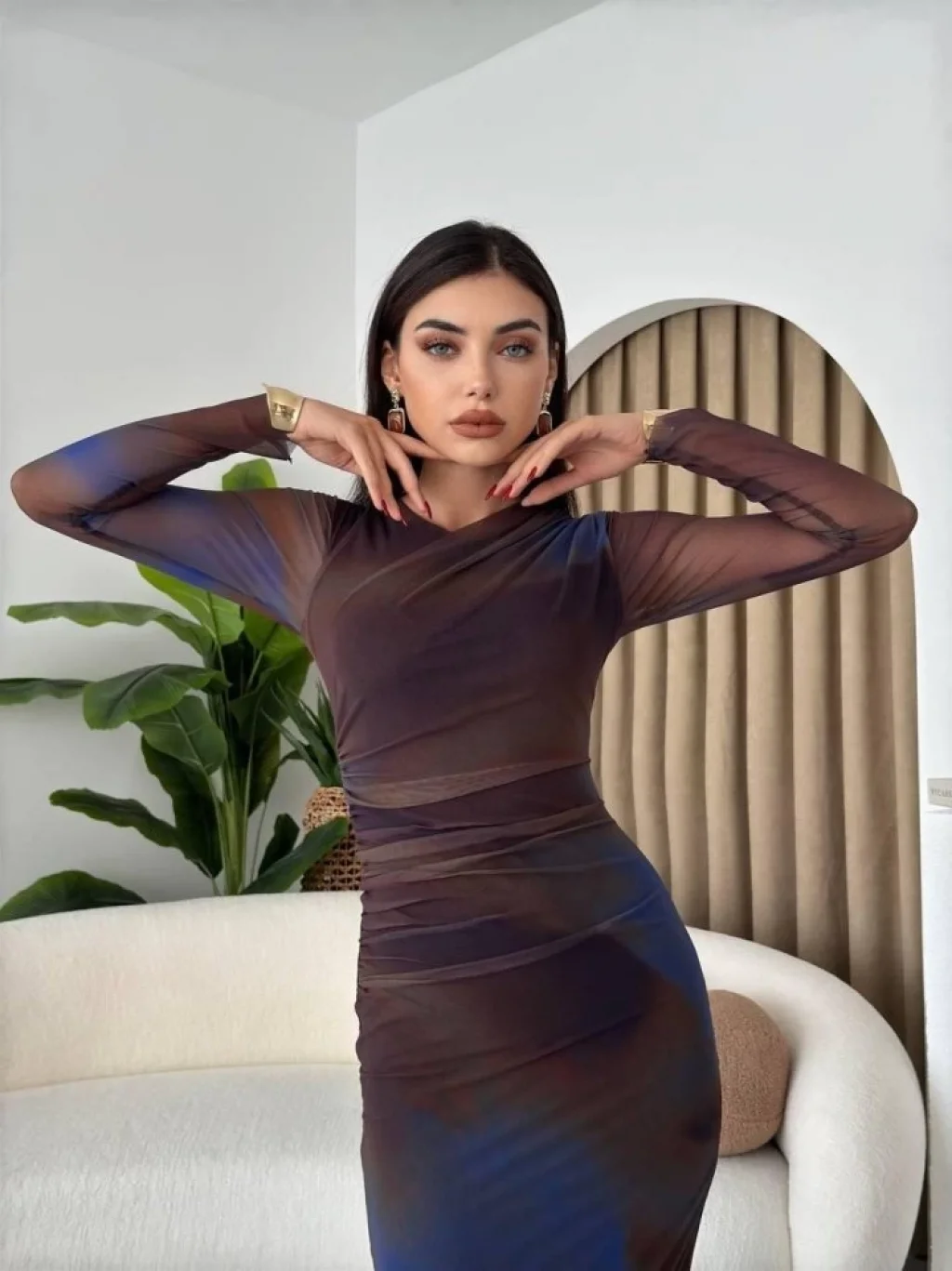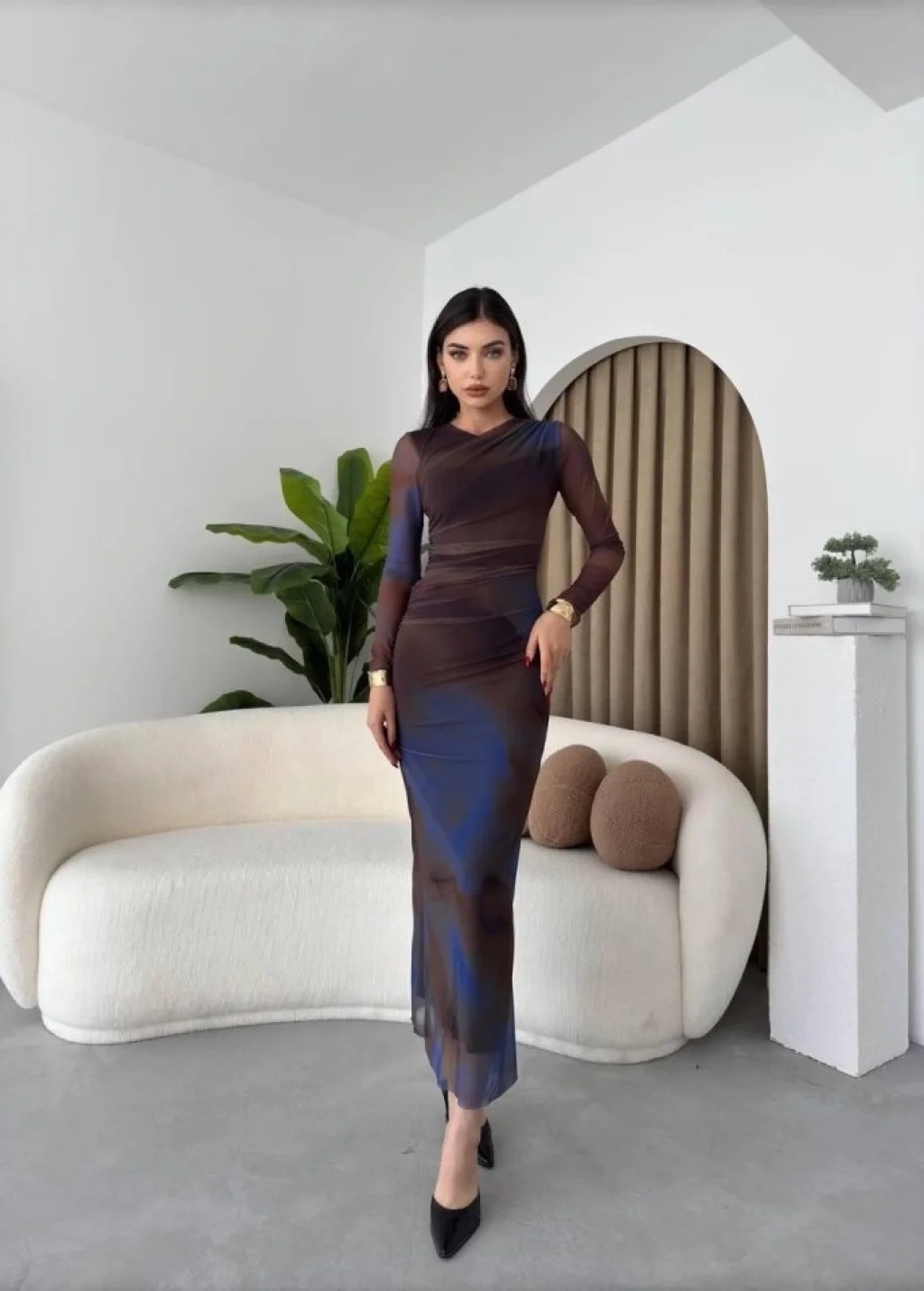 Kadın Uzun Kollu Geometrik Yaka Midi Ithal Krep Elbise