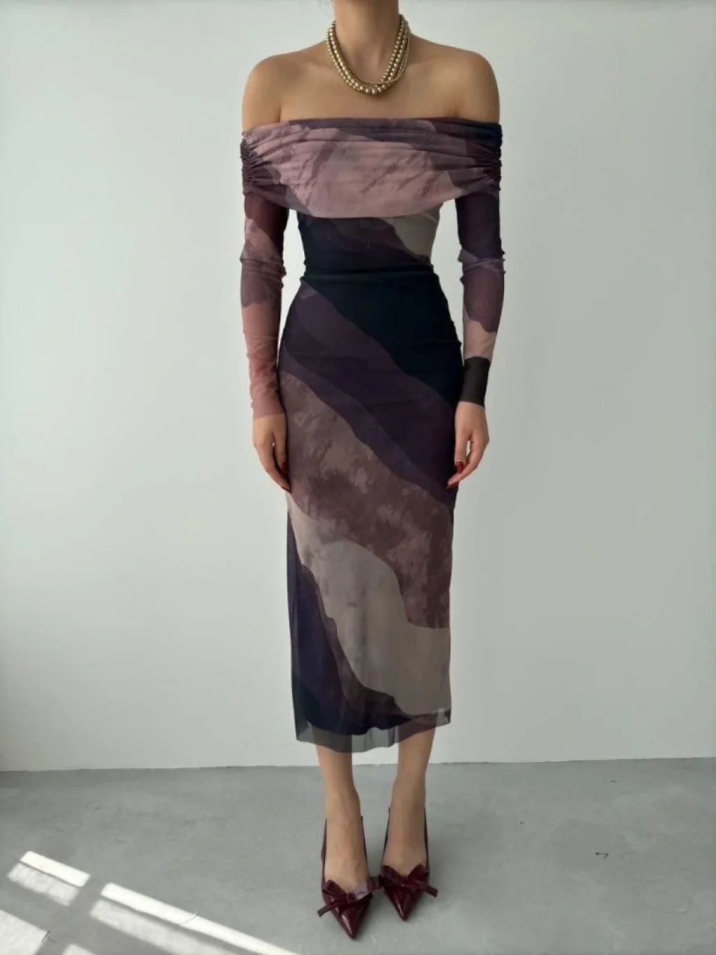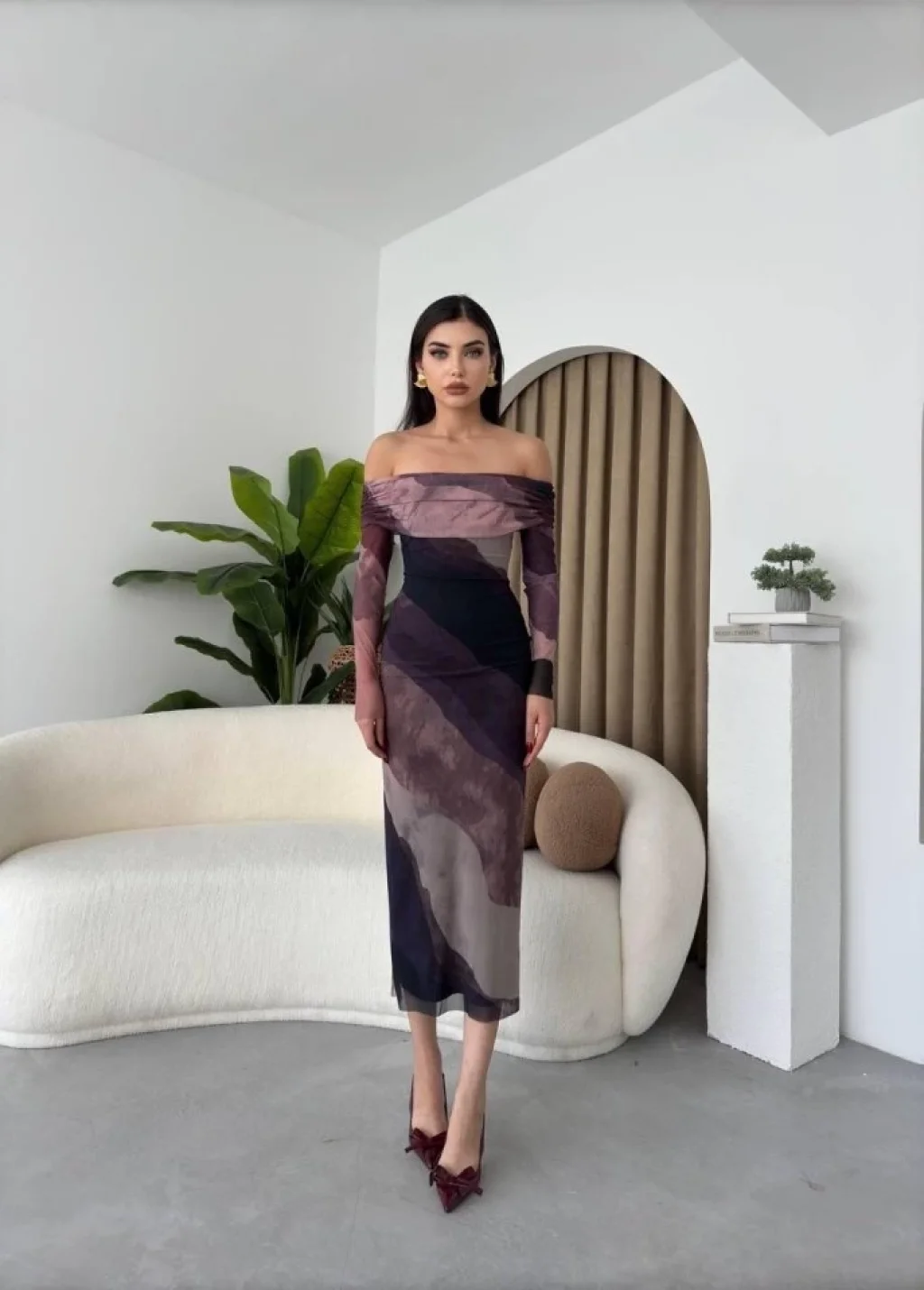 Kadın Uzun Kollu Geometrik Yaka Midi Ithal Krep Elbise