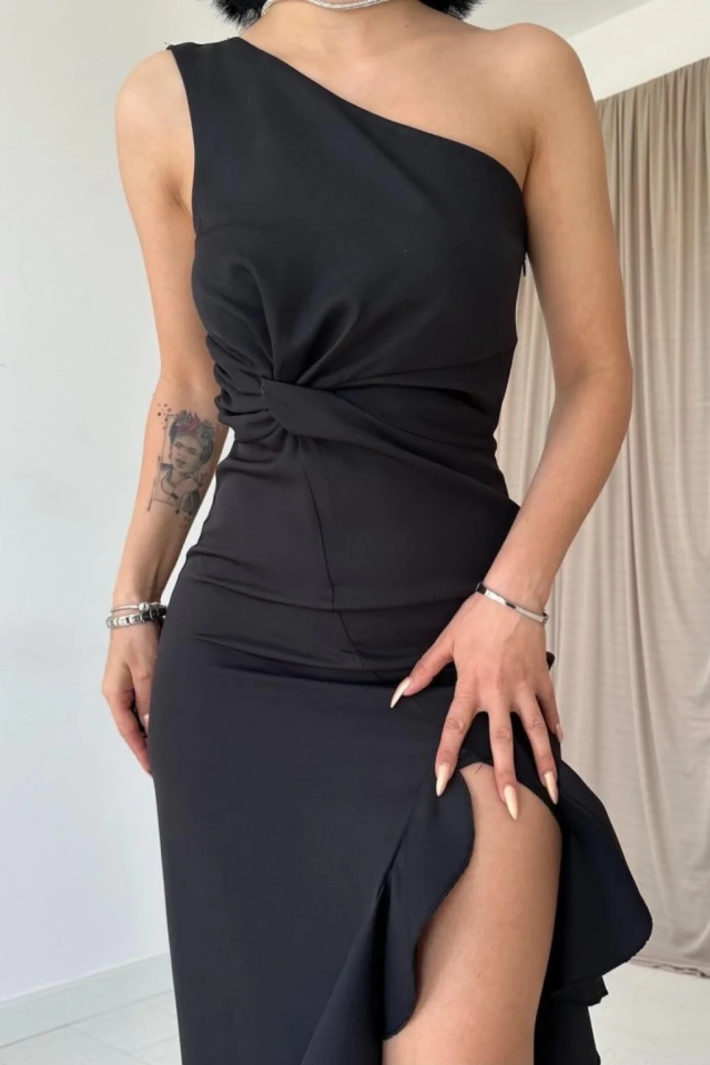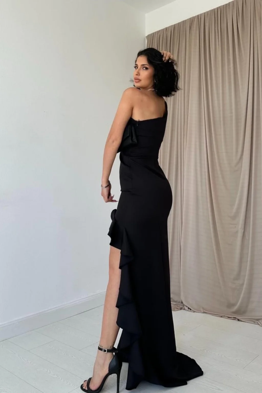 <p>Siyah Yırtmaçlı Volanlı Elbise</p><br> <p>Modelin Ölçüleri: Boy:165, Kg:55, Göğüs:90, Bel:72, Kalça: 100</p><br> <p>Modelin üzerindeki ürün M/38 bedendir</p><br> <ul> </ul>