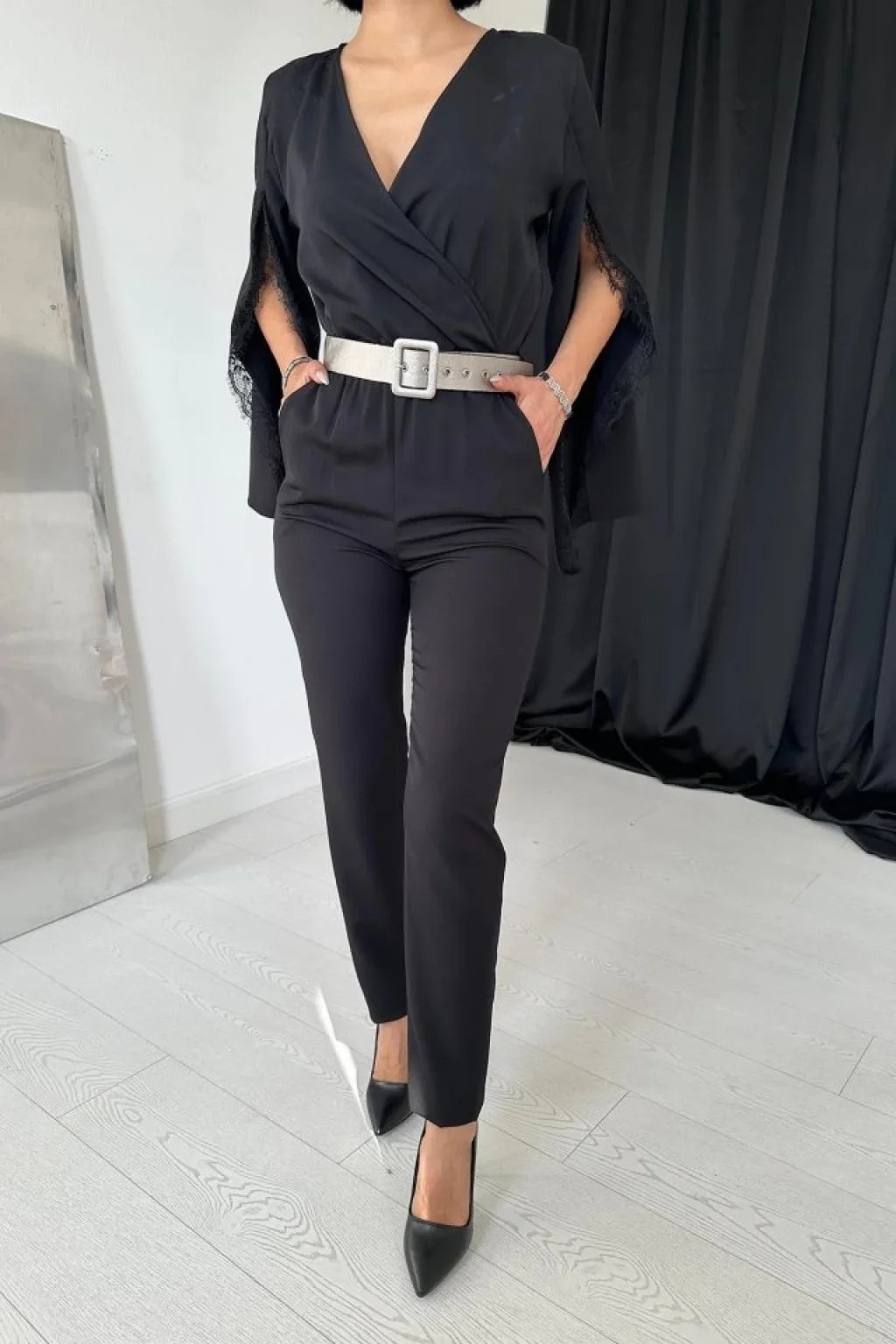 Kadın Uzun Kollu Kruvaze Yakalı Kolları Tül Detay Beli Kuşaklı Ithal Krep Tulum