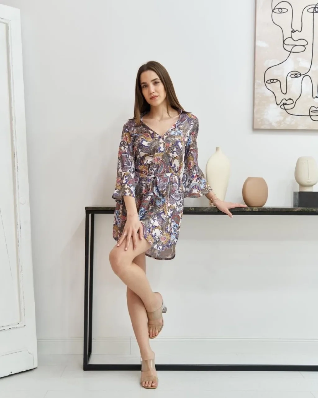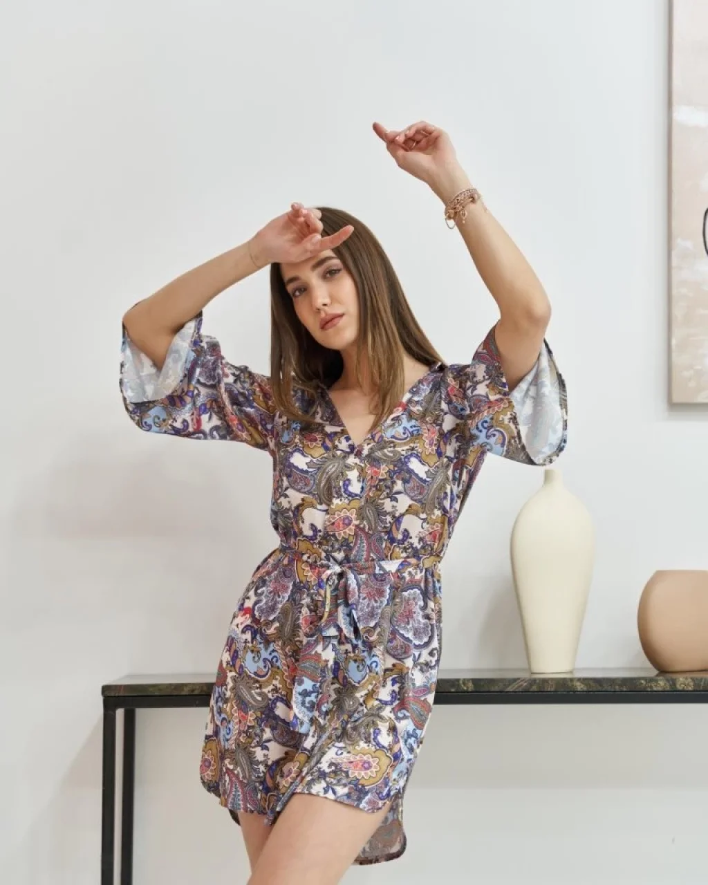 Kadın Uzun Kollu V Yakalı çiçek Baskılı Belden Kuşaklı Midi Saten Gecelik