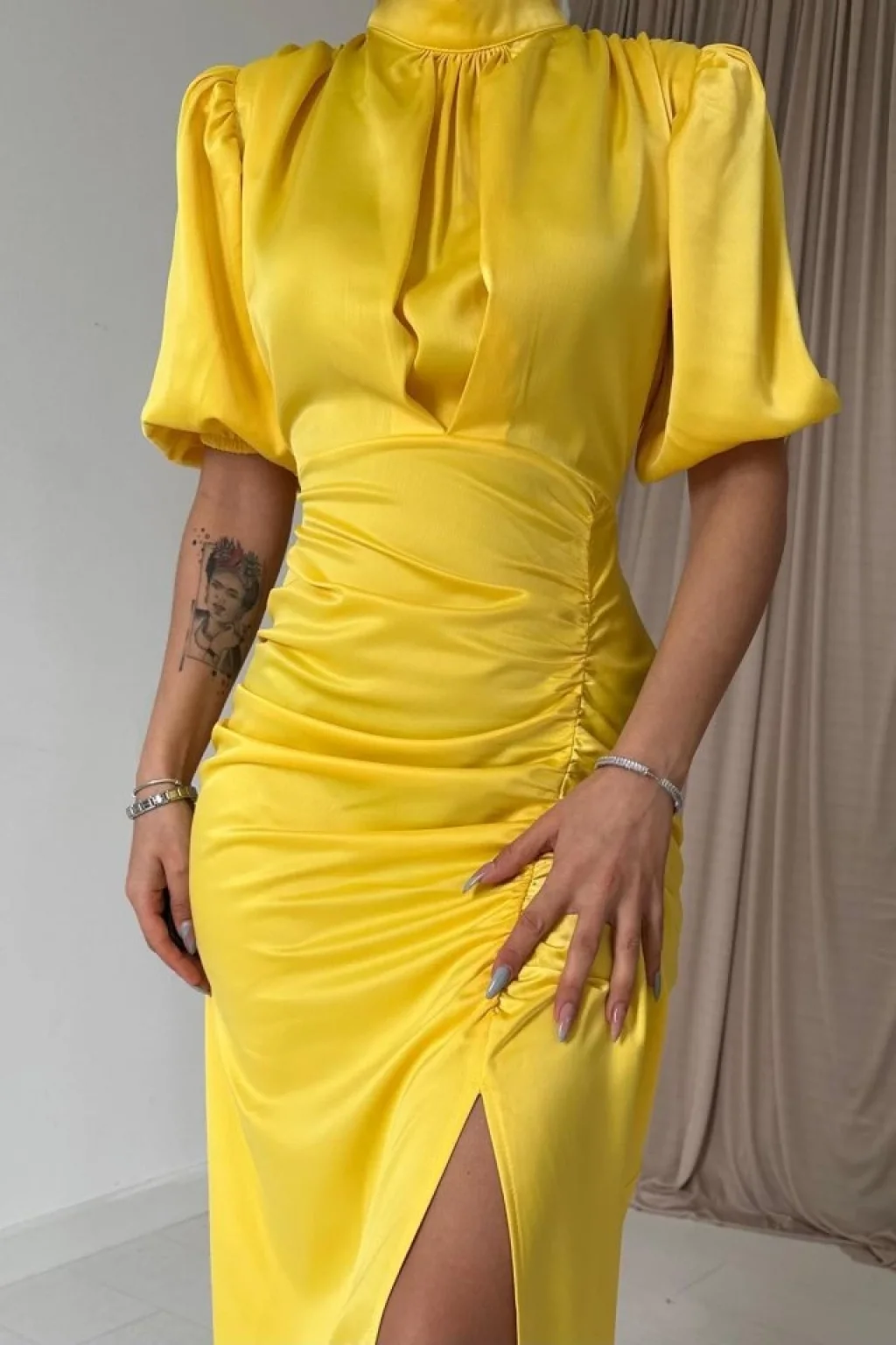 <p>Sarı Büzgülü Saten Elbise</p><br> <p>Modelin Ölçüleri: Boy:165, Kg:55, Göğüs:90, Bel:72, Kalça: 100</p><br> <p>Modelin üzerindeki ürün M/38 bedendir</p><br> <ul> </ul>