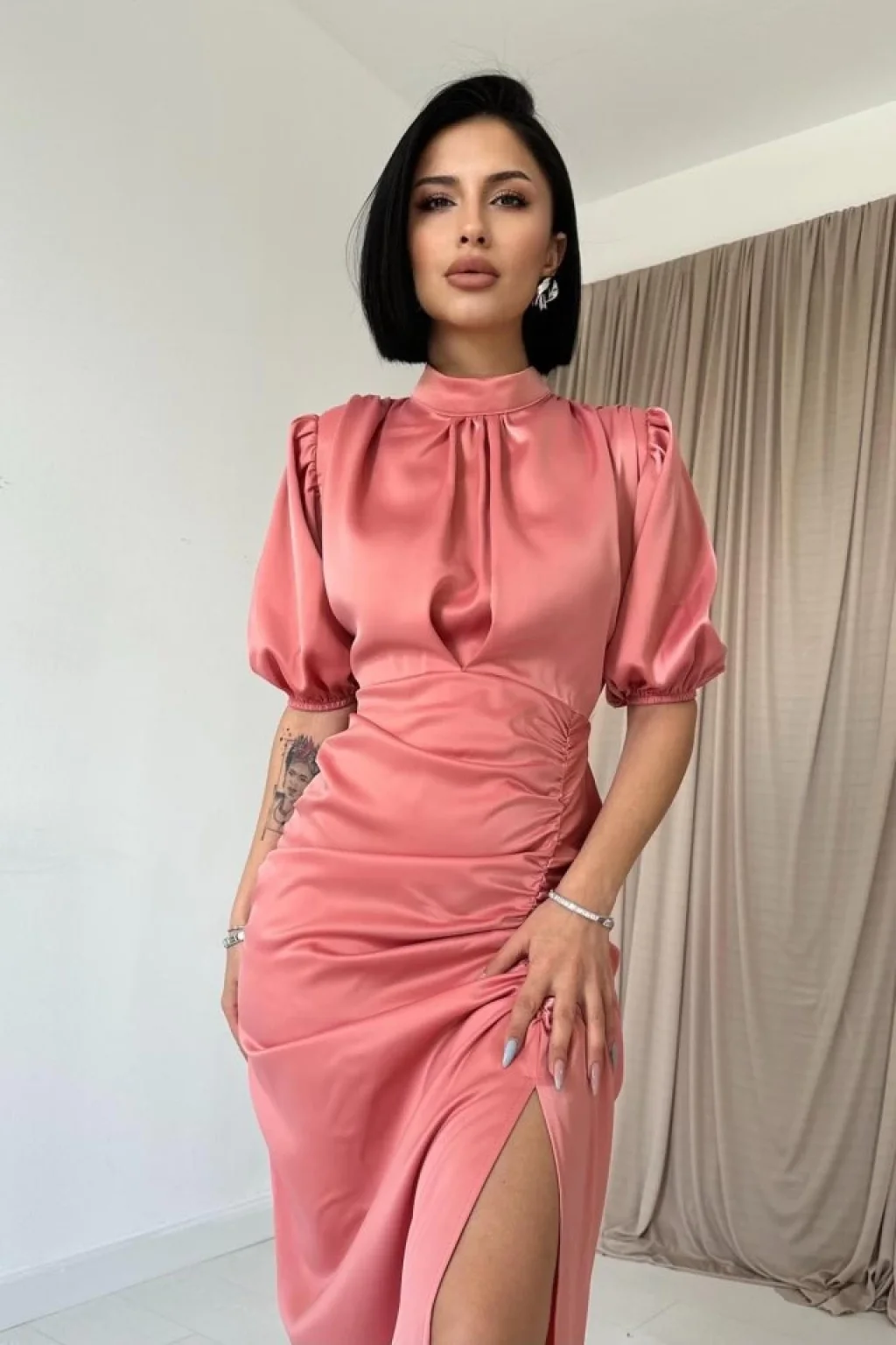 <p>Pudra Büzgülü Saten Elbise</p><br> <p>Modelin Ölçüleri: Boy:165, Kg:55, Göğüs:90, Bel:72, Kalça: 100</p><br> <p>Modelin üzerindeki ürün M/38 bedendir</p><br> <ul> </ul>