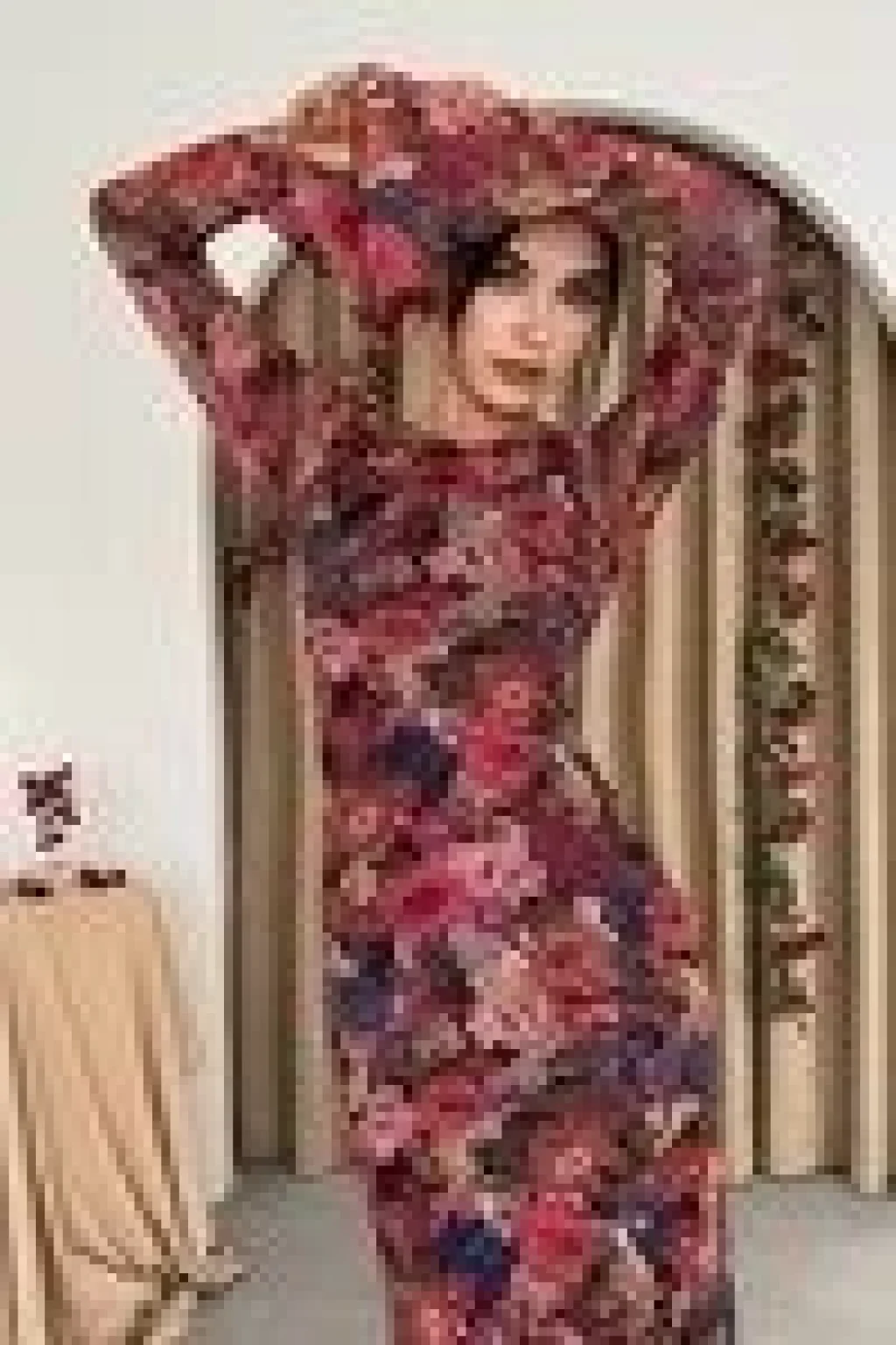 Kadın Uzun Kollu V Yakalı çiçek Baskılı Belden Kuşaklı Midi Saten Gecelik
