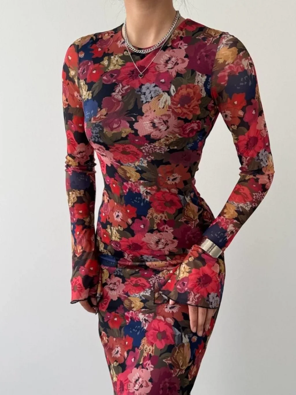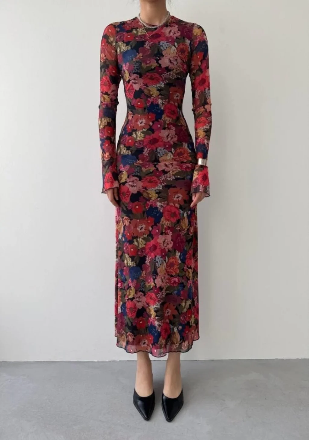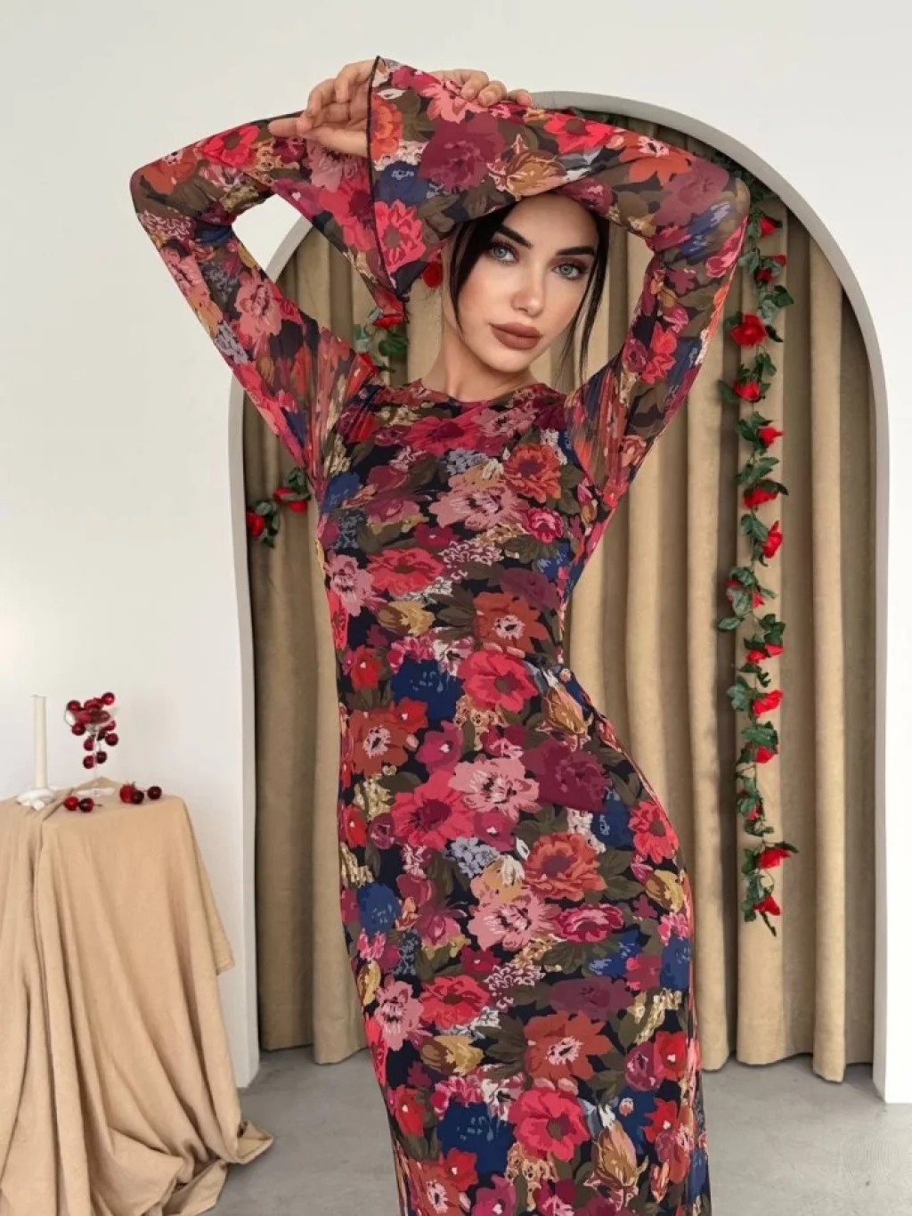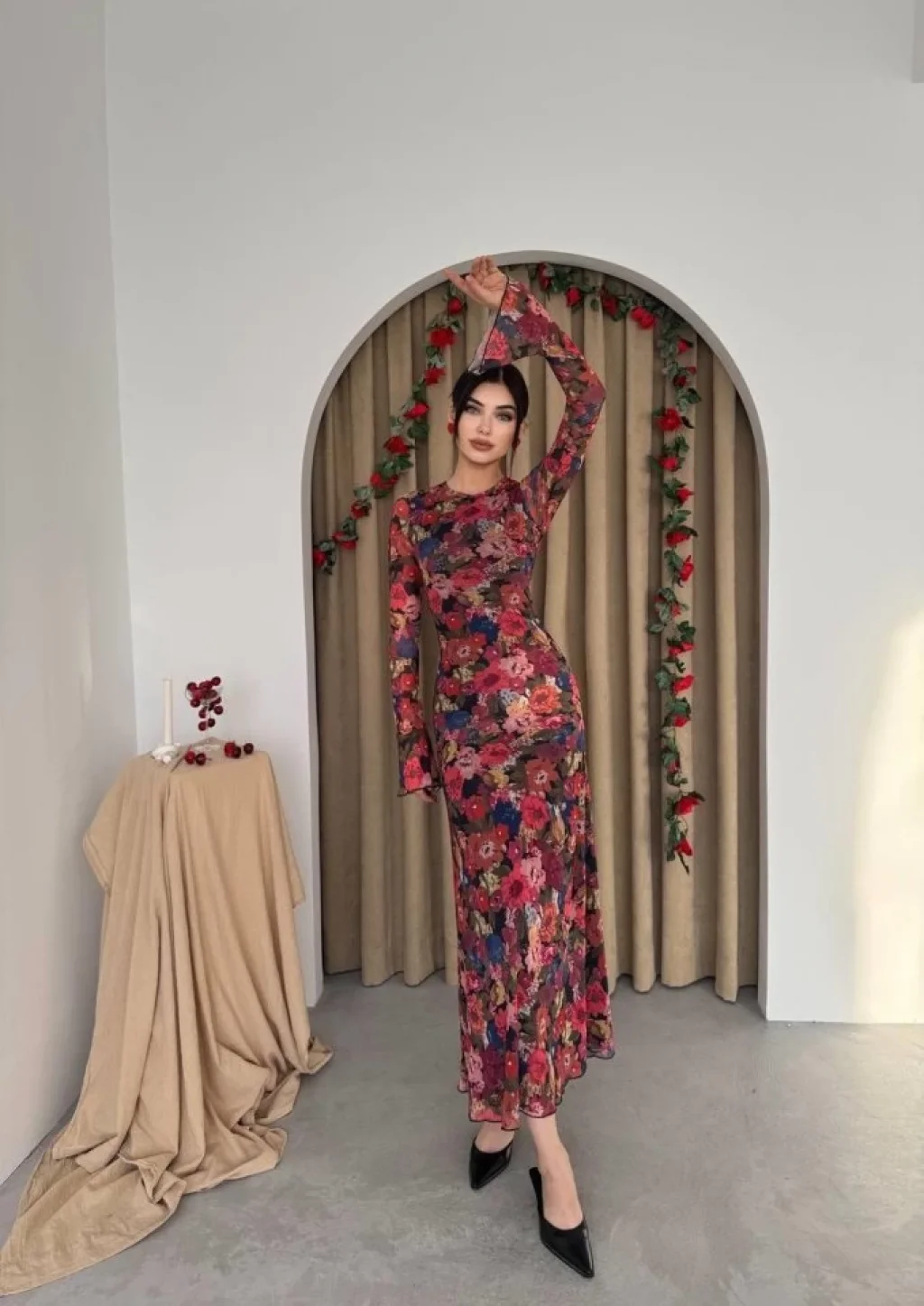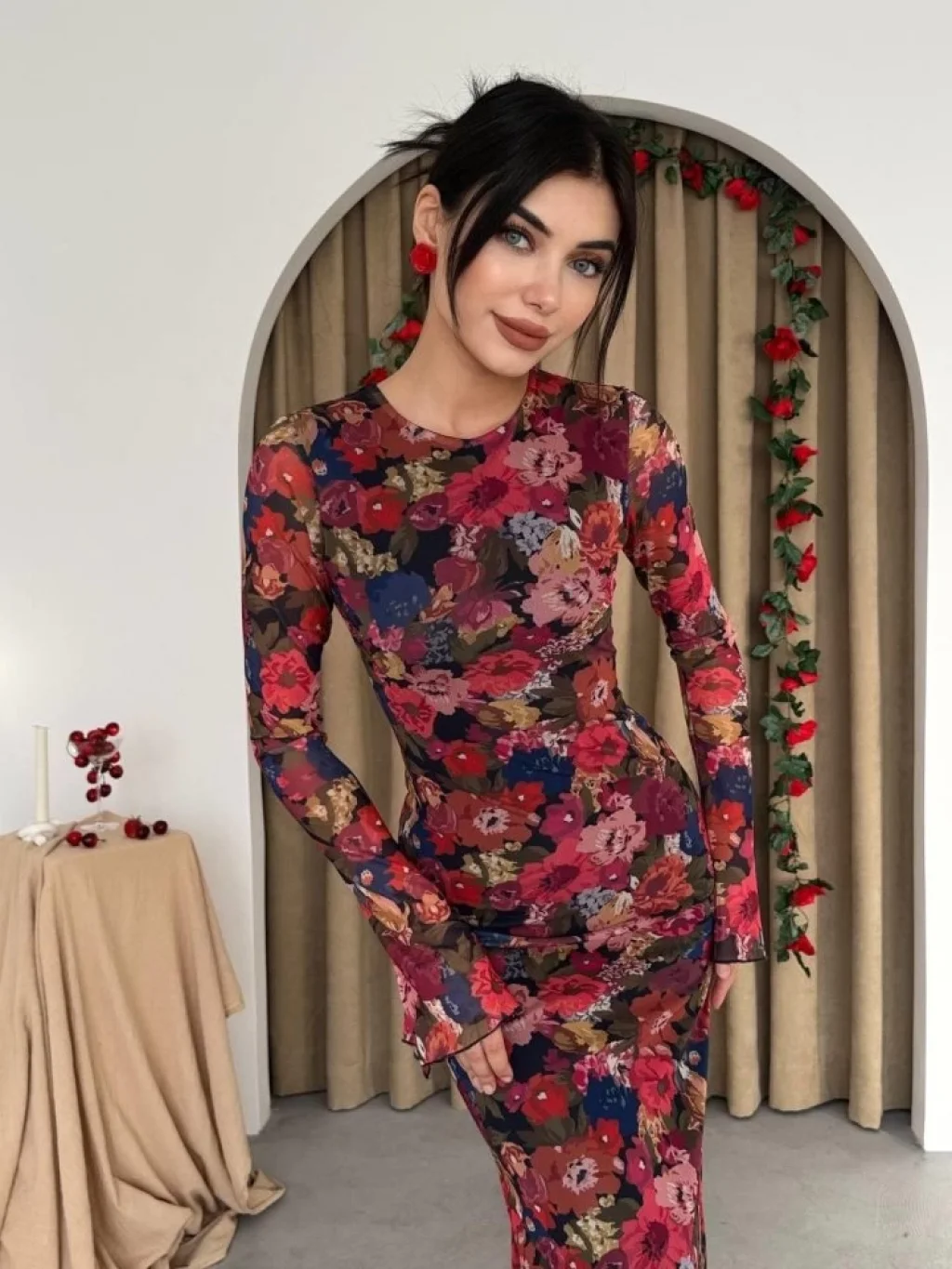 Kadın Uzun Kollu Kruvaze Yakalı Desenli Süprem Maxi Elbise