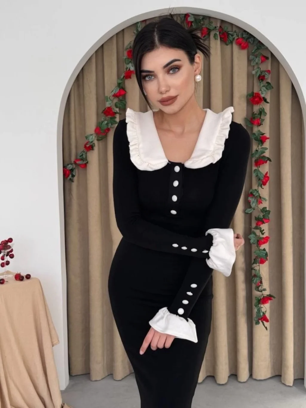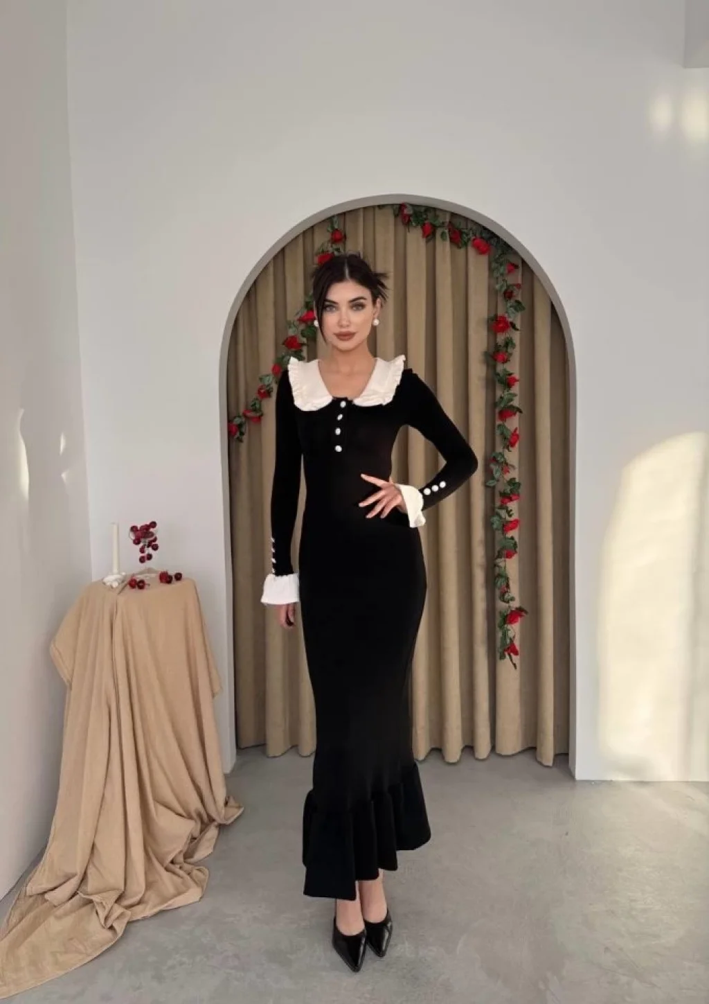 <p>Sura Bebe Yaka Elbise</p><br> <p>Modelin Ölçüleri: Boy:165, Kg:55, Göğüs:90, Bel:72, Kalça: 100</p><br> <p>Modelin üzerindeki ürün M/38 bedendir</p><br> <ul> </ul>