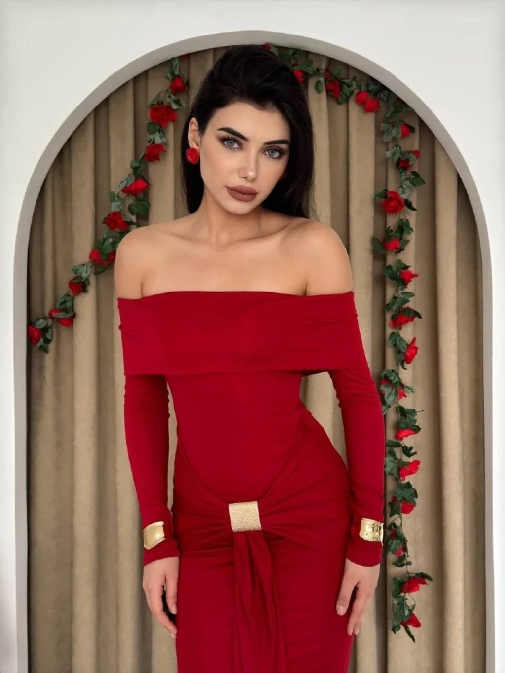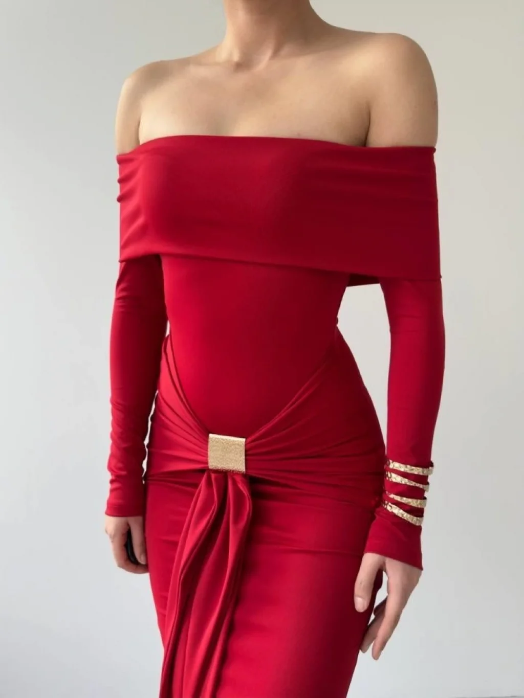 Kadın Uzun Kollu Geometrik Yaka Midi Ithal Krep Elbise