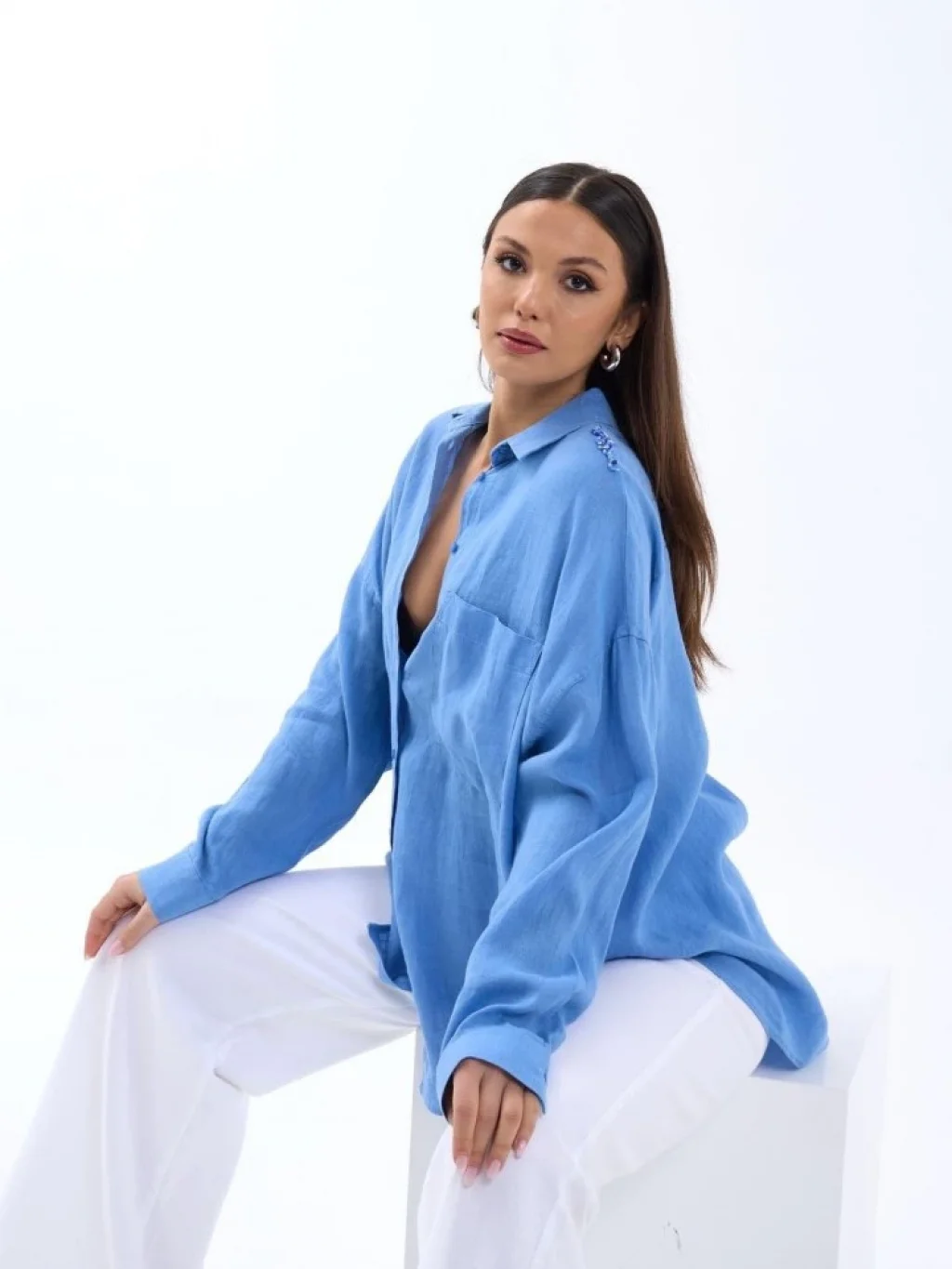 Kadın Dokuma Viskon Kumaş V Yaka Dekolte Ve Metal Düğme Detaylı Gömlek