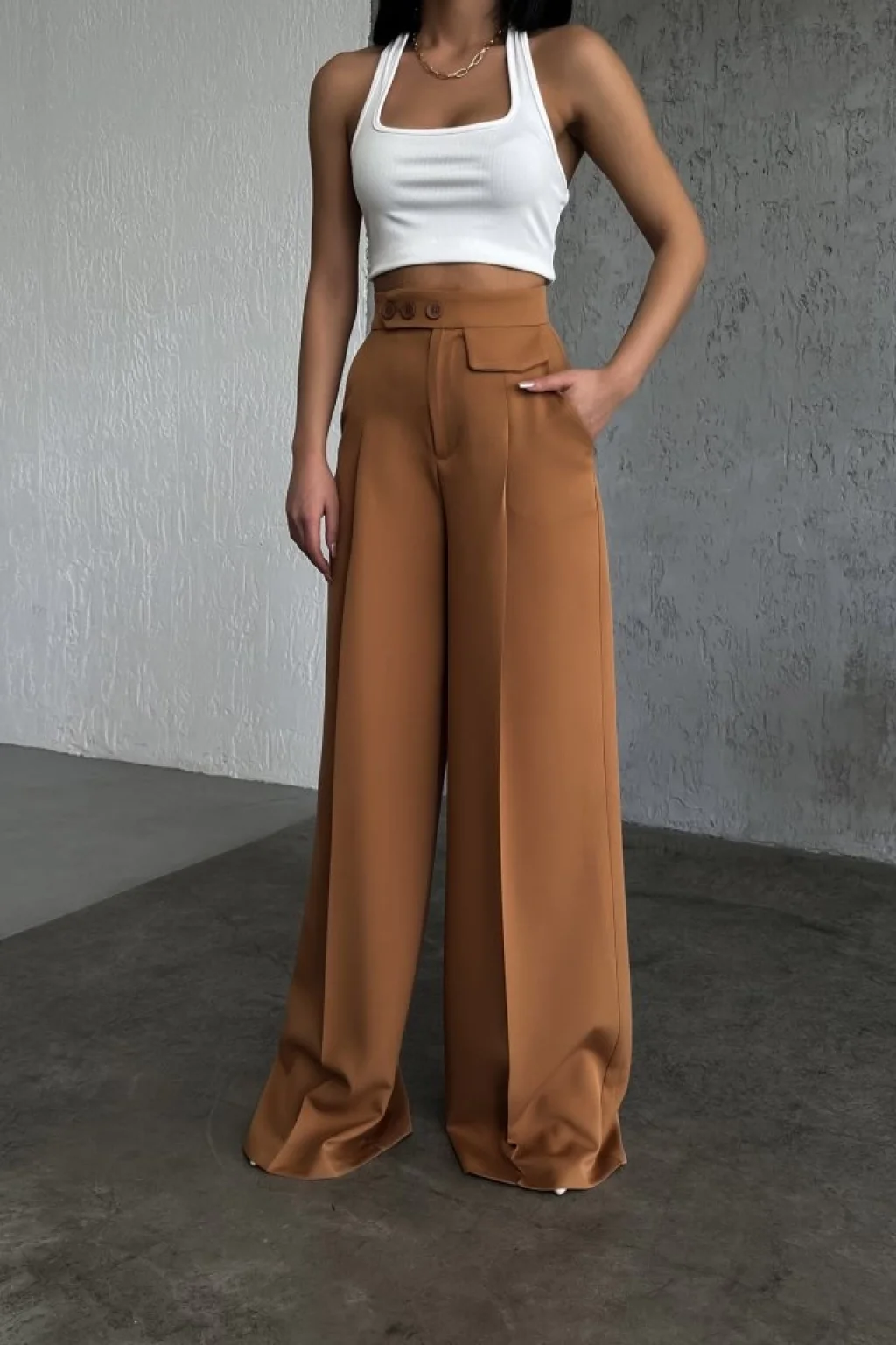 <p>Üç Düğme Detayli Palazzo Pantolon</p><br> <p>Modelin Ölçüleri: Boy:165, Kg:55, Göğüs:90, Bel:72, Kalça: 100</p><br> <p>Modelin üzerindeki ürün M/38 bedendir</p><br> <ul> </ul>