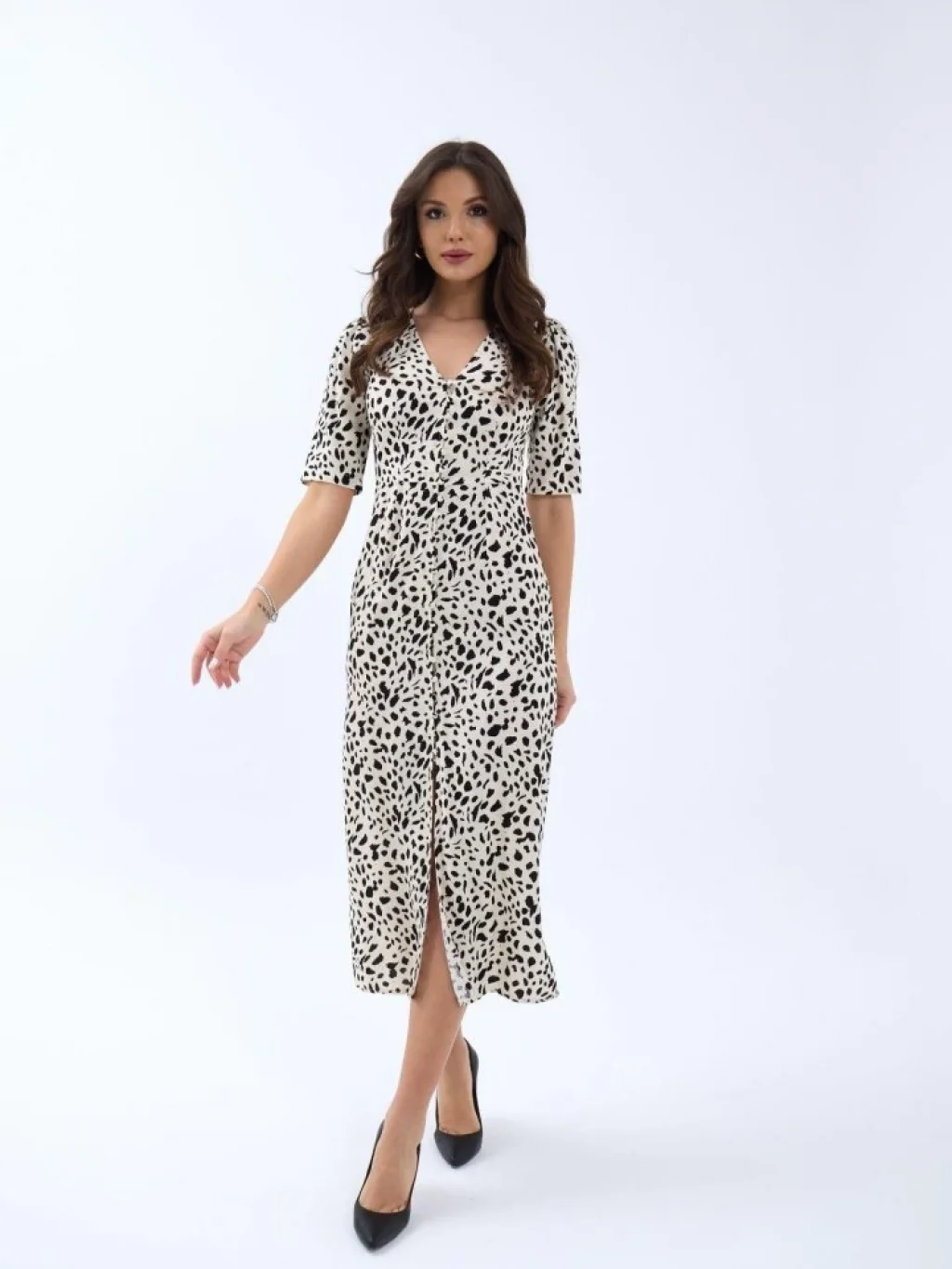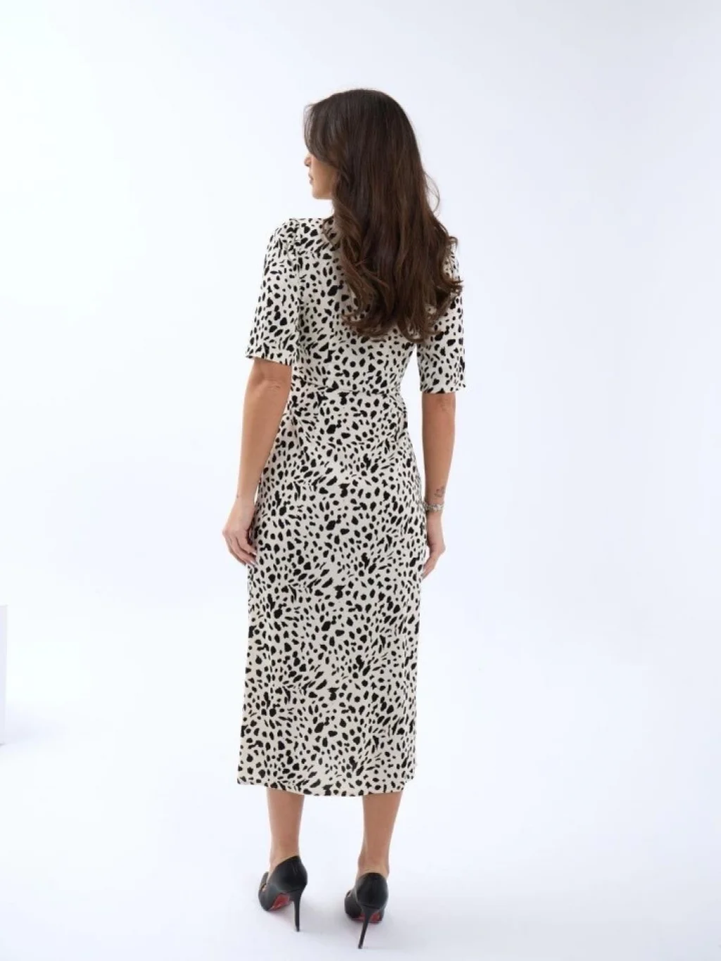 Kadın Uzun Kollu Kruvaze Yakalı Fırfırlı Belden Kuşaklı Leopar Desen Modal Elbise