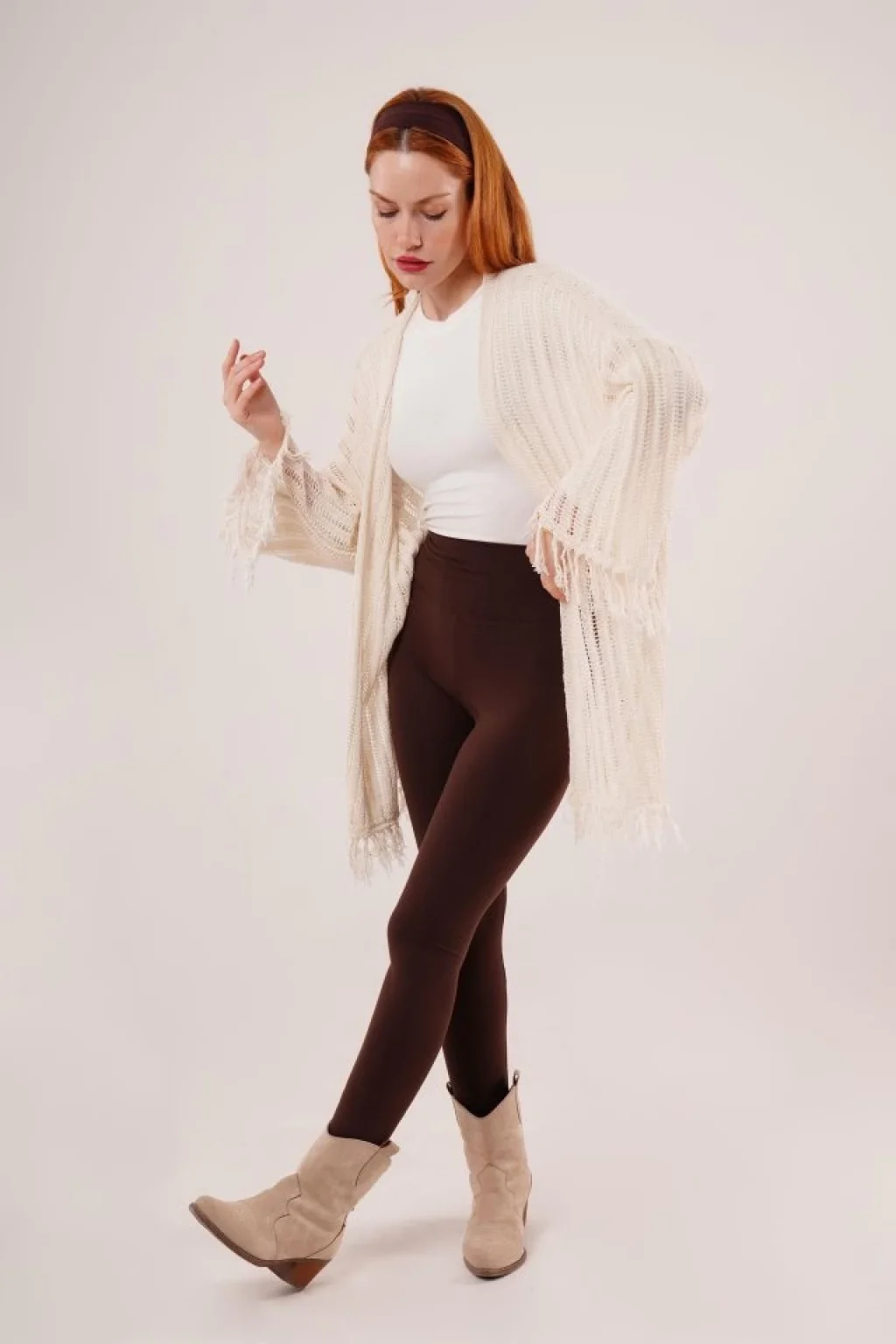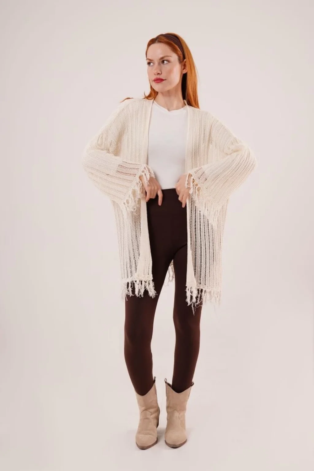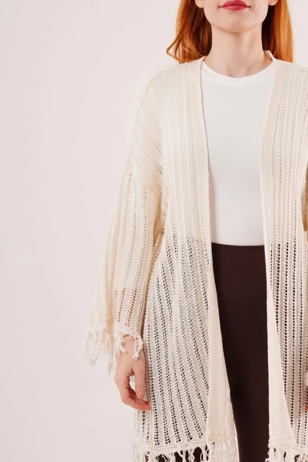 Delikli Geçişli Püskül Detay Uzun Triko Krem Hırka