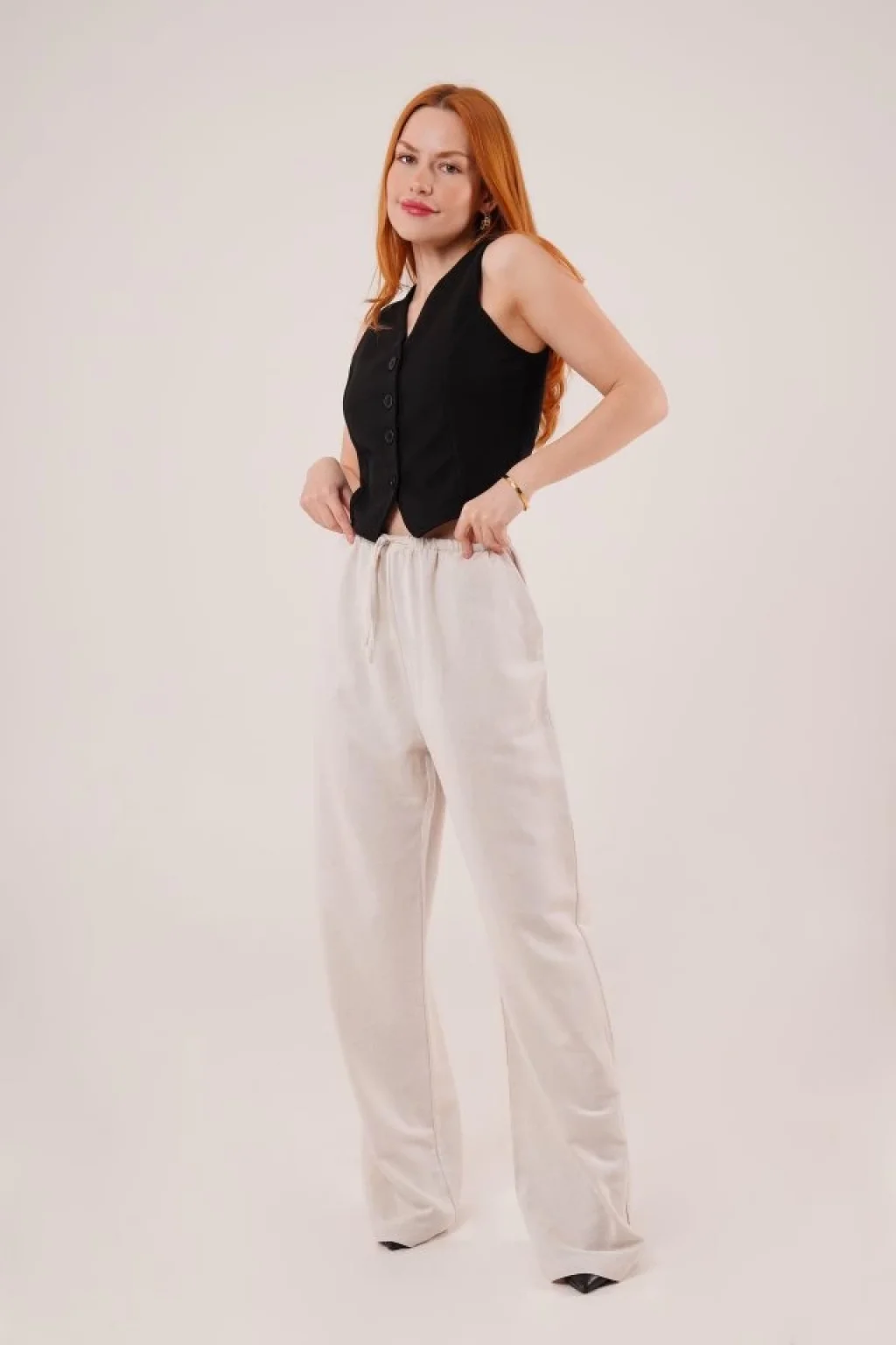 Cepli Bağlama Detaylı Keten Ekru Pantolon