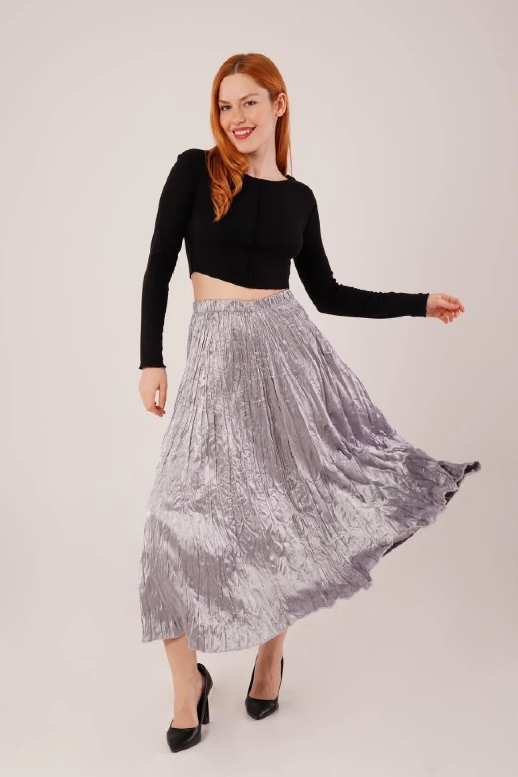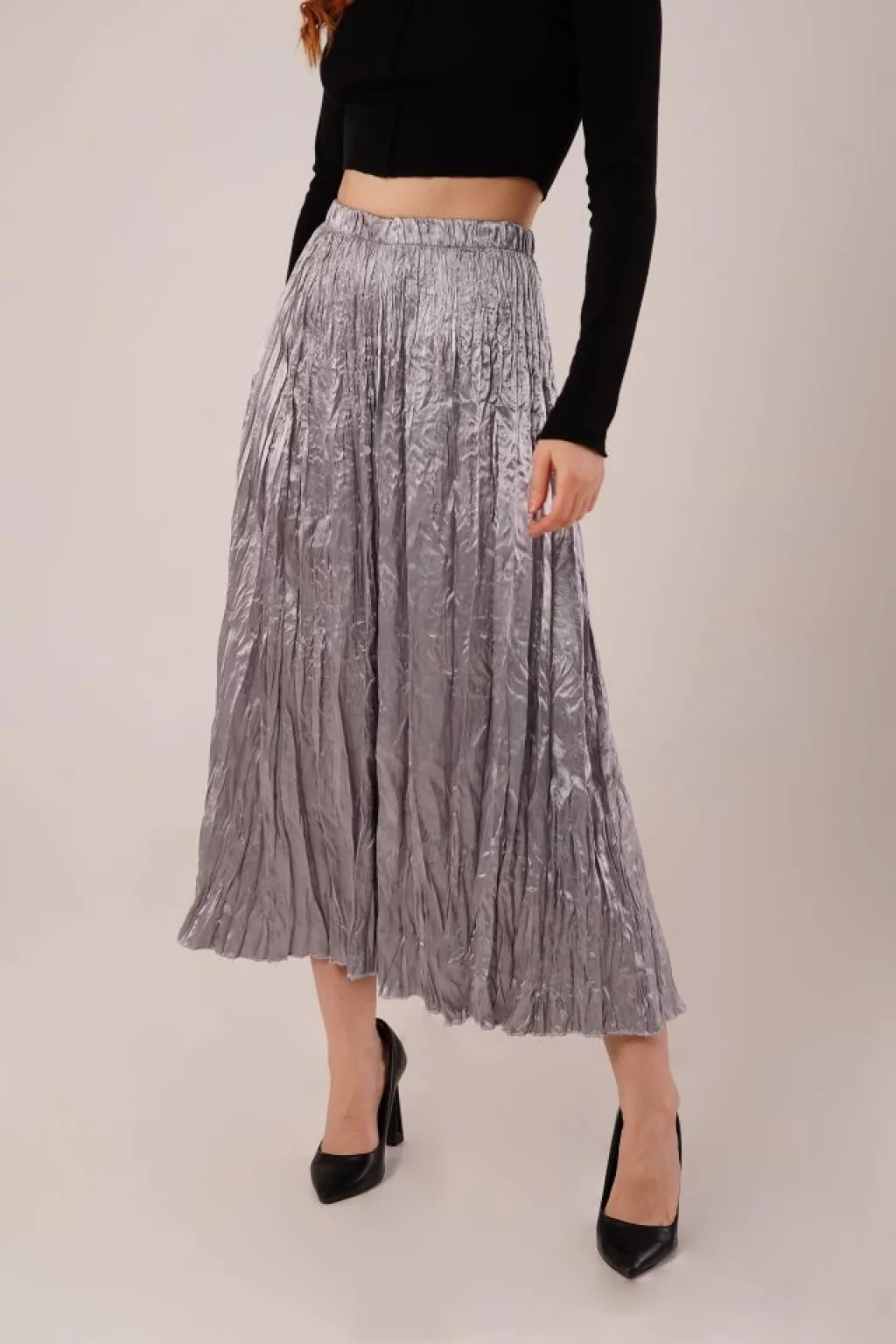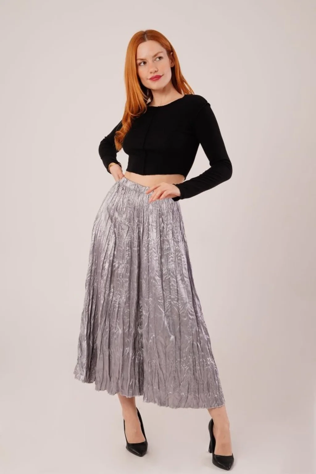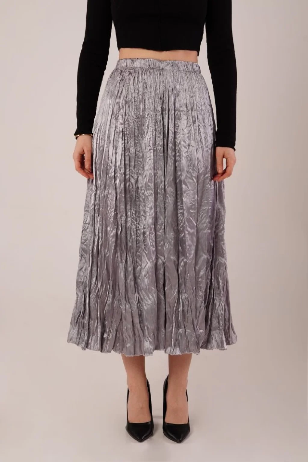 <p>Midi Boy Pileli Saten Gri Etek</p><br> <p>Modelin Ölçüleri: Boy:165, Kg:55, Göğüs:90, Bel:72, Kalça: 100</p><br> <p>Modelin üzerindeki ürün M/38 bedendir</p><br> <ul> </ul>