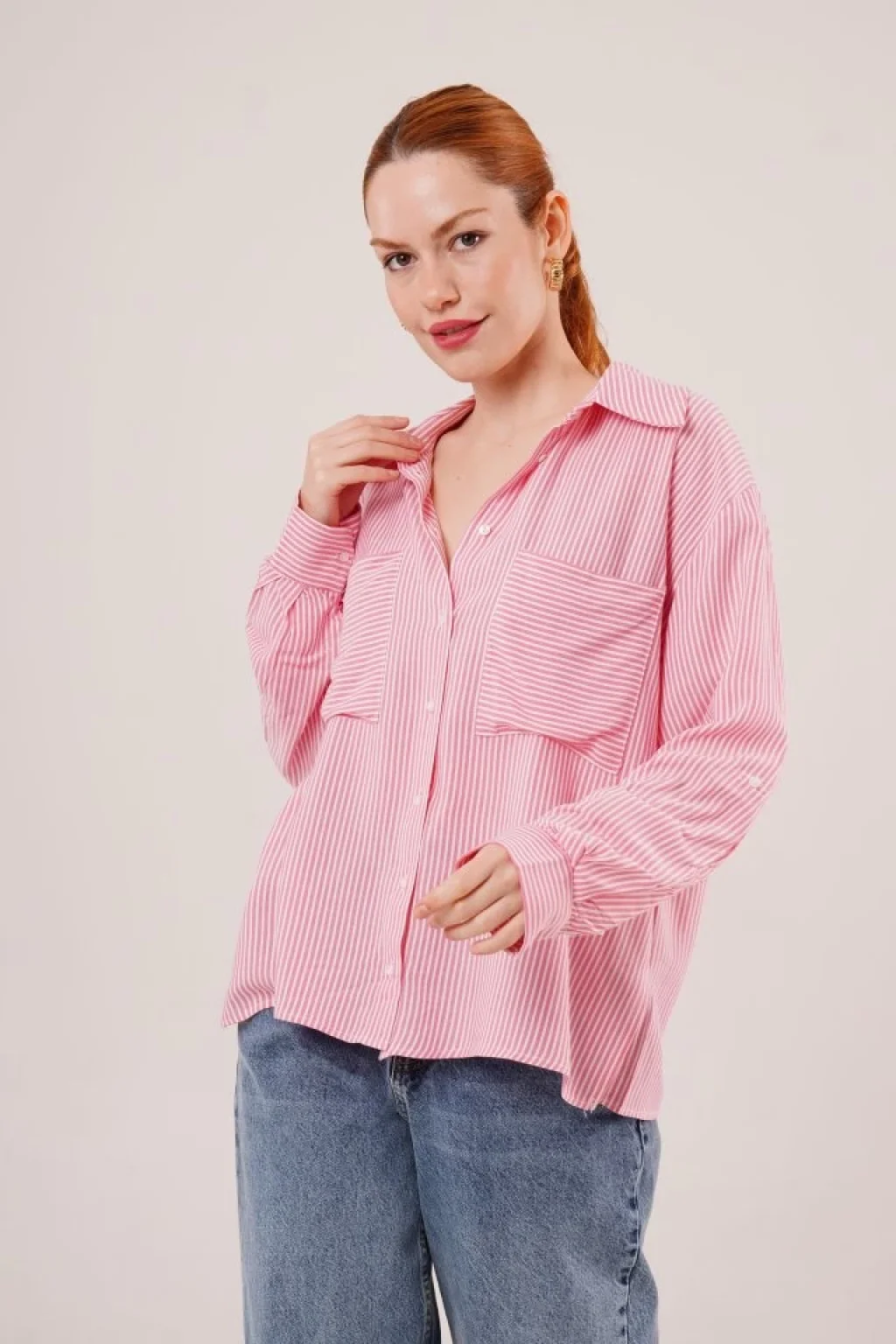 <p>Yarasa Kol Çizgili Cep Detaylı Pembe Gömlek</p><br> <p>Modelin Ölçüleri: Boy:165, Kg:55, Göğüs:90, Bel:72, Kalça: 100</p><br> <p>Modelin üzerindeki ürün M/38 bedendir</p><br> <ul> </ul>