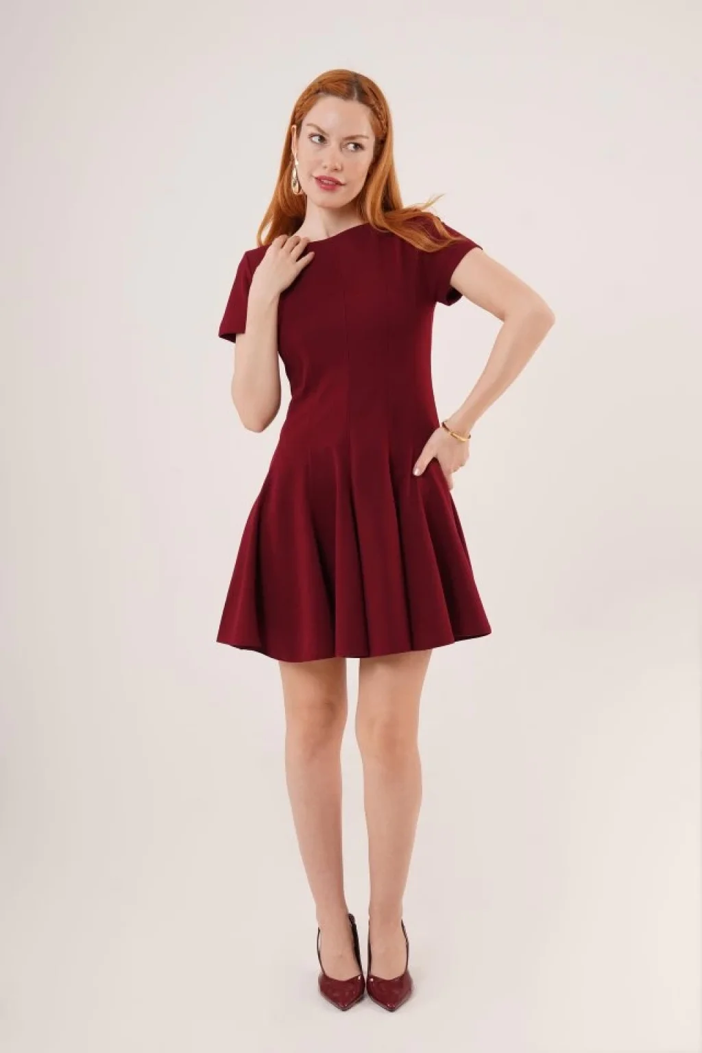Önden Dikiş Detaylı Çan Model Bordo Elbise