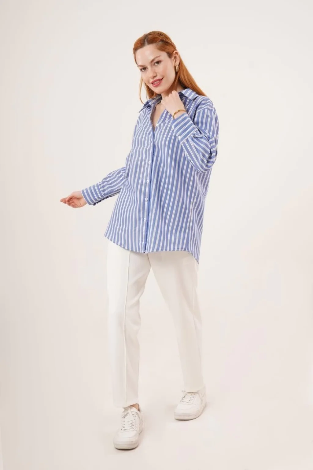 Kadın Uzun Kollu Fırfır Yakalı önden Düğmeli çizgili Burgu Gömlek