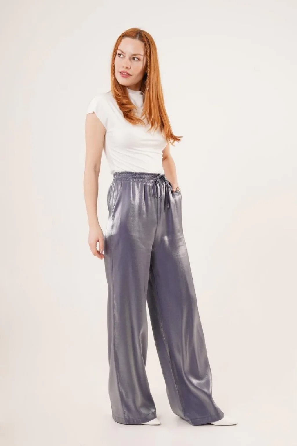 Parlak Görünümlü Cepli Mor Bol Paça Pantolon