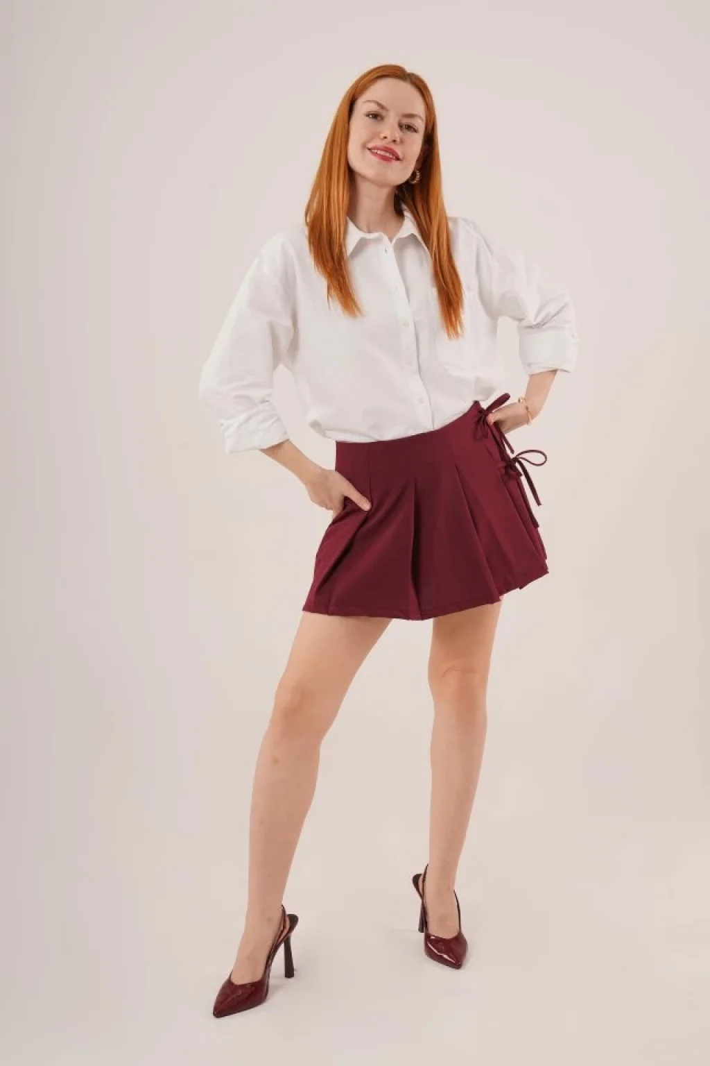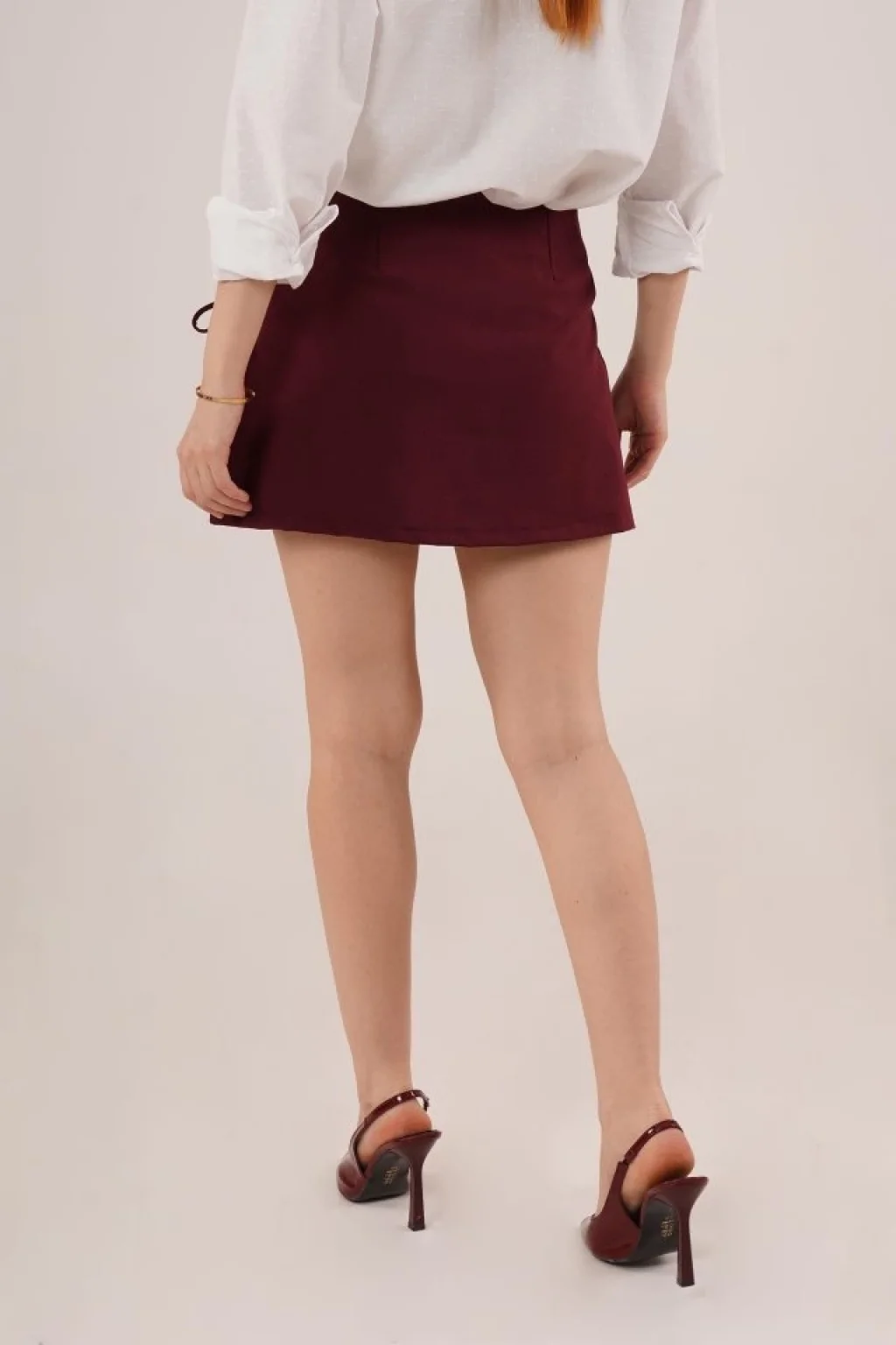 Önü Piliseli Yandan Bağlama Detaylı Bordo Mini Şort Etek