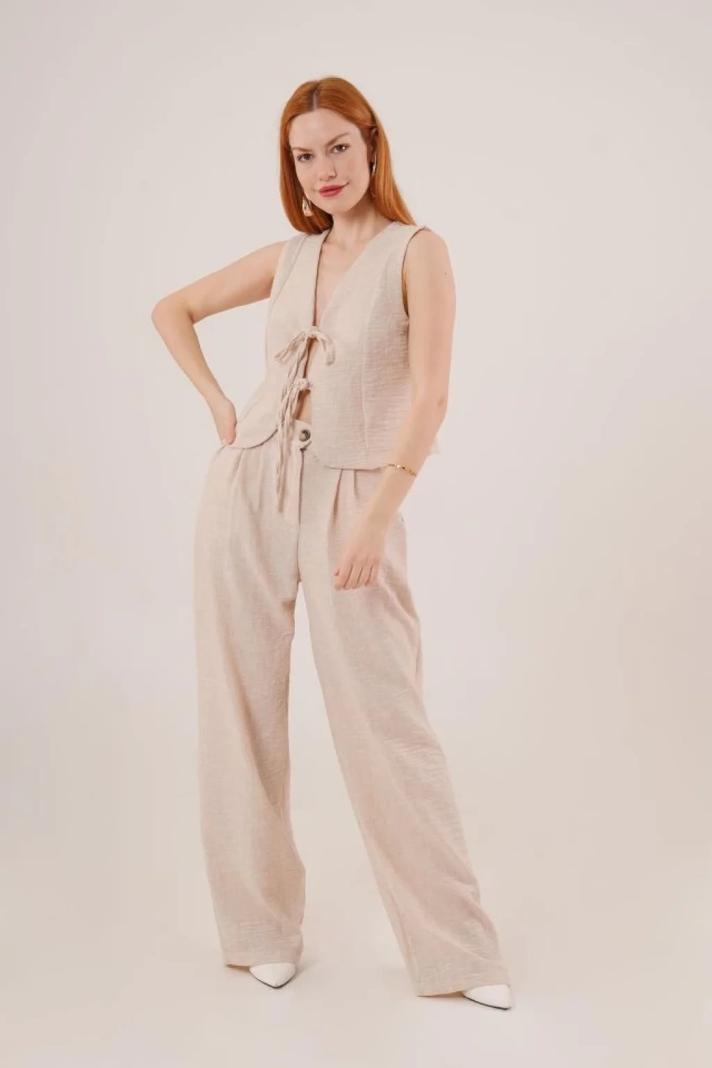 <p>Ön Bağlama Detaylı Yelek Ve Pantolon Taş İkili Takım</p><br> <p>Modelin Ölçüleri: Boy:165, Kg:55, Göğüs:90, Bel:72, Kalça: 100</p><br> <p>Modelin üzerindeki ürün M/38 bedendir</p><br> <ul> </ul>