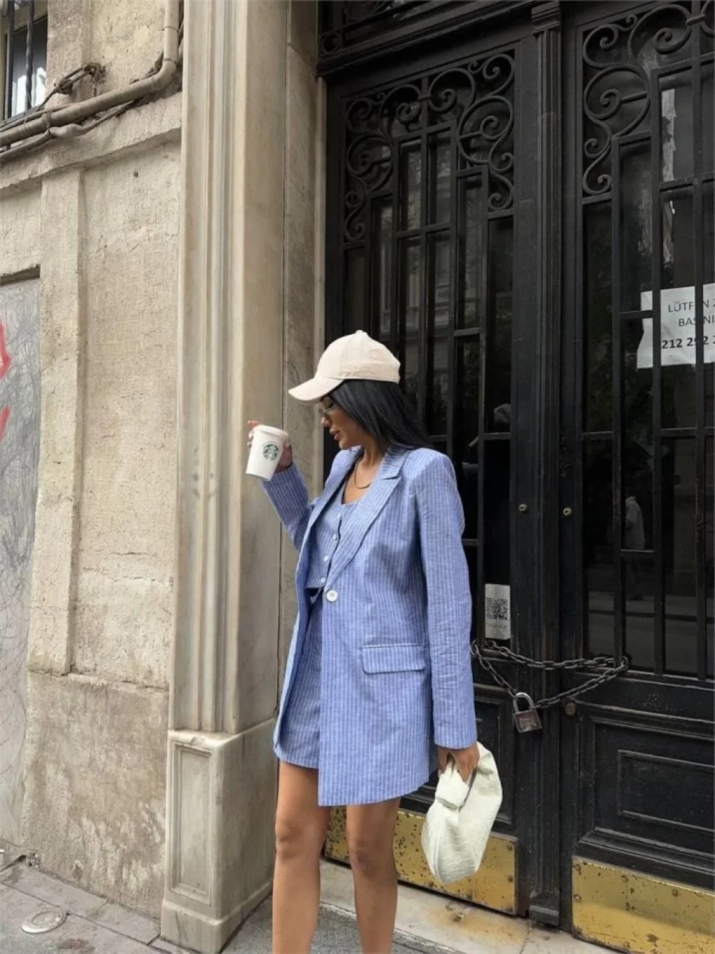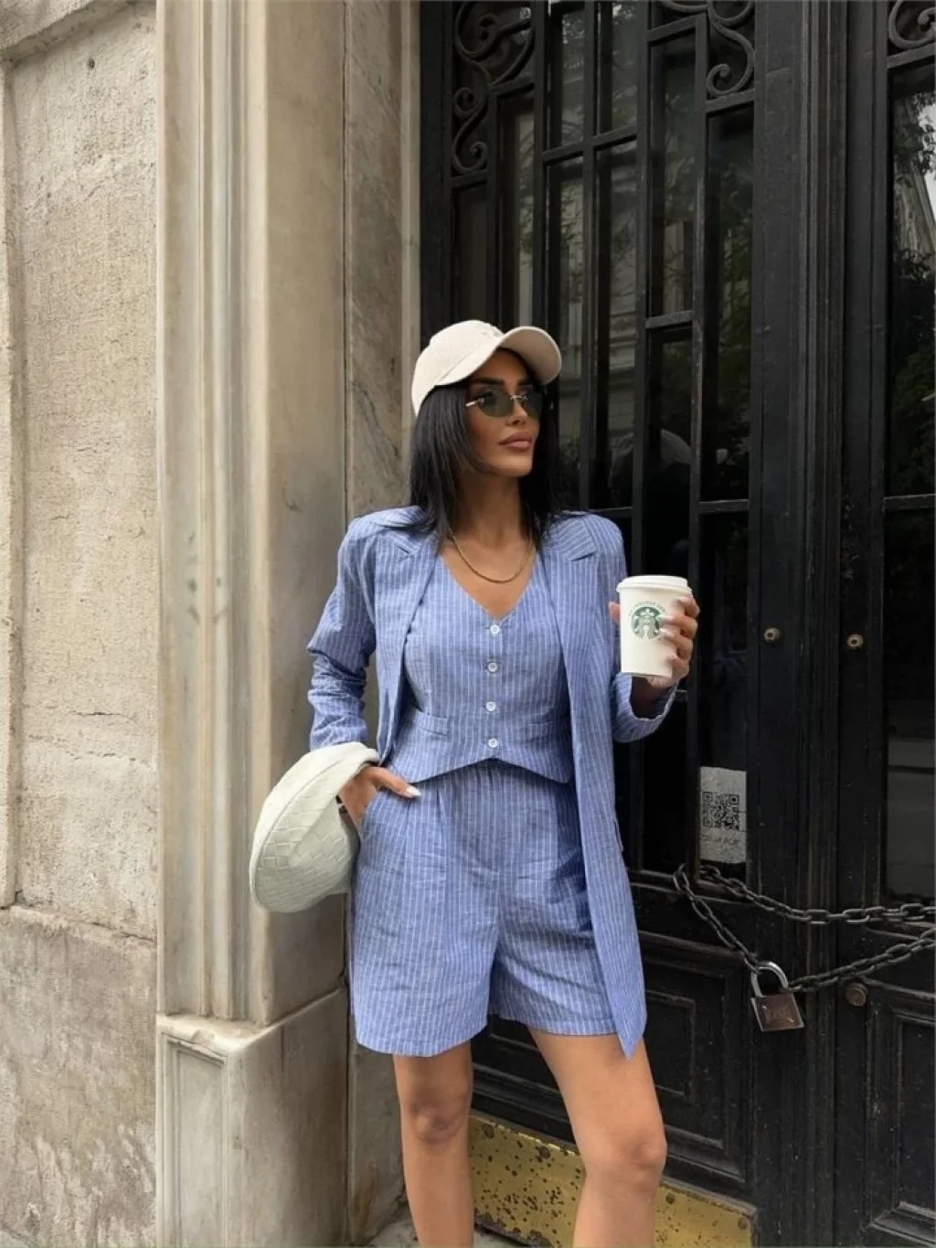 ÇİZGİLİ KETEN CEKET YELEK ŞORT TK - Mavi