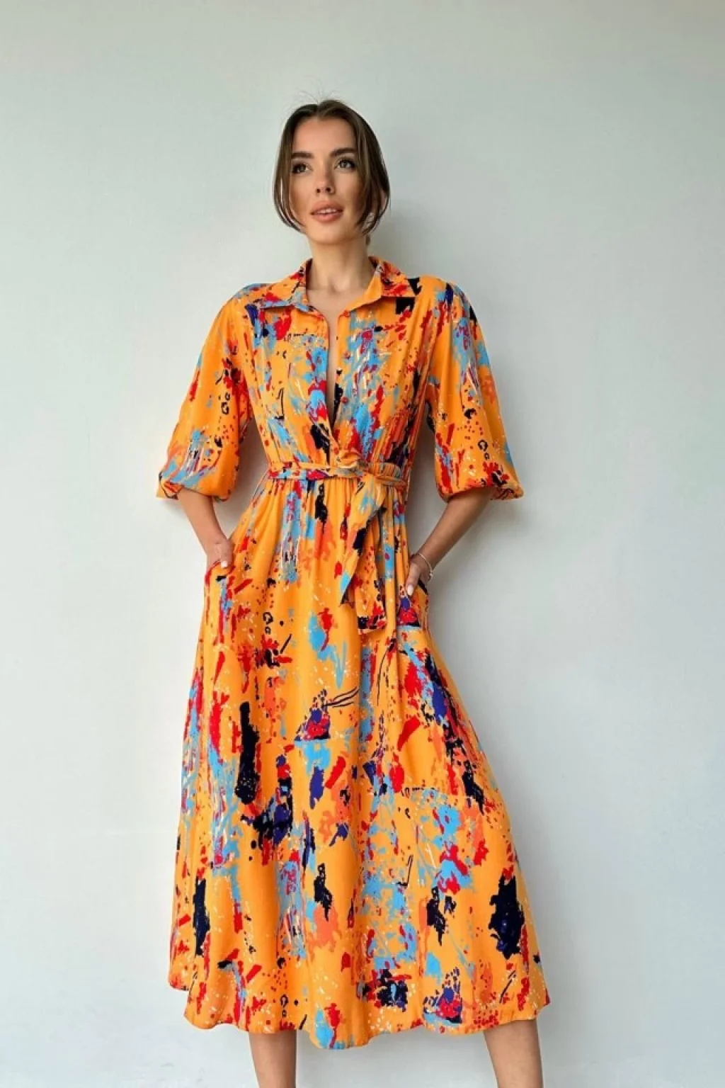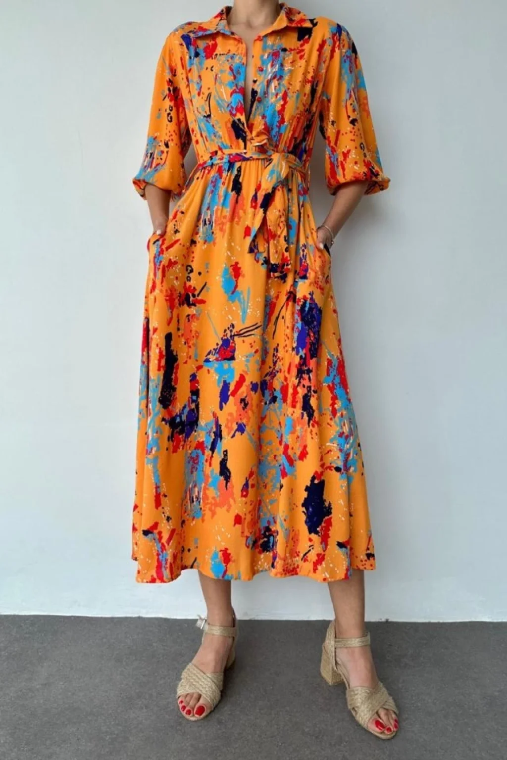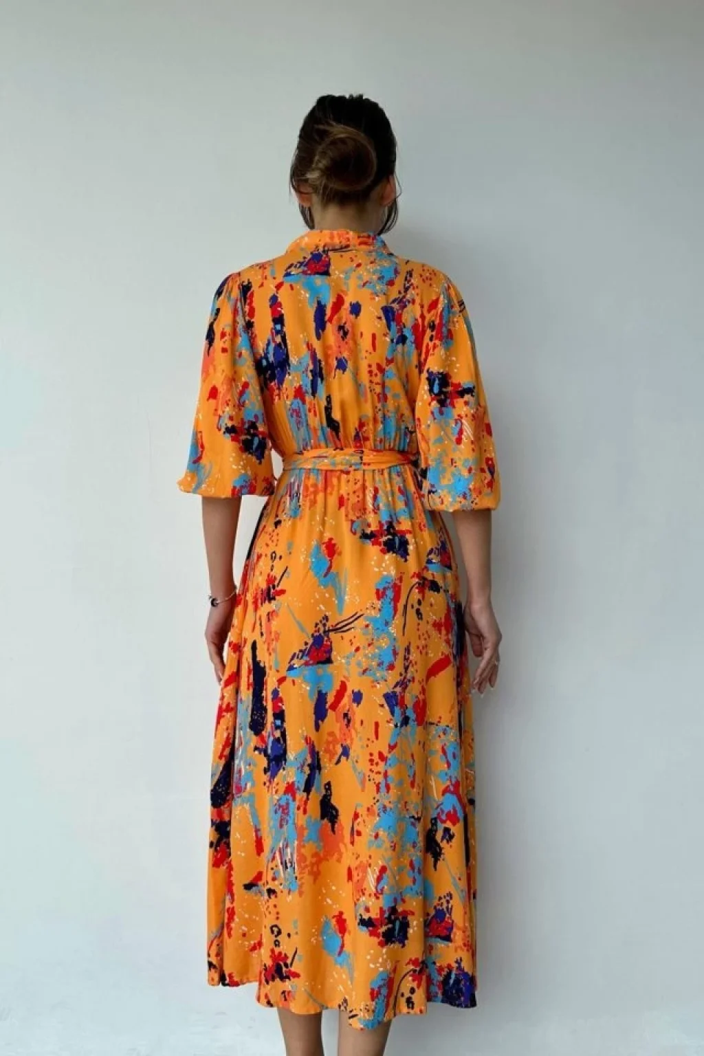 <p>Oranj Çiçek Desenli Kemerli Elbise</p><br> <p>Modelin Ölçüleri: Boy:165, Kg:55, Göğüs:90, Bel:72, Kalça: 100</p><br> <p>Modelin üzerindeki ürün M/38 bedendir</p><br> <ul> </ul>