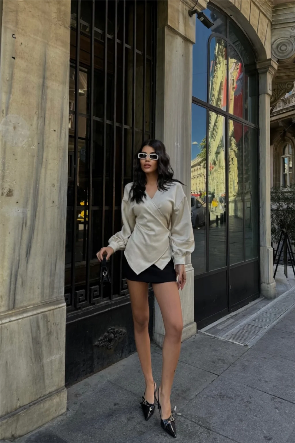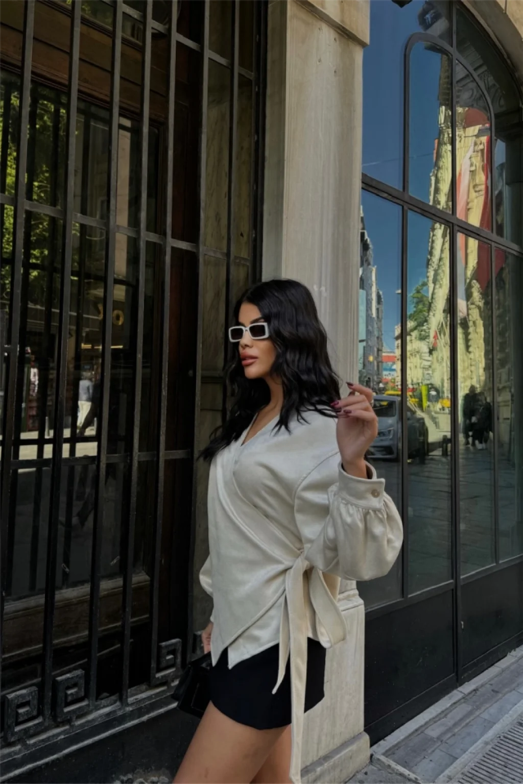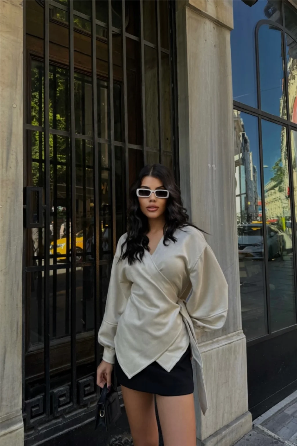 SÜET KRUVAZE BLUZ BAĞLAMA DETAYLI - Taş