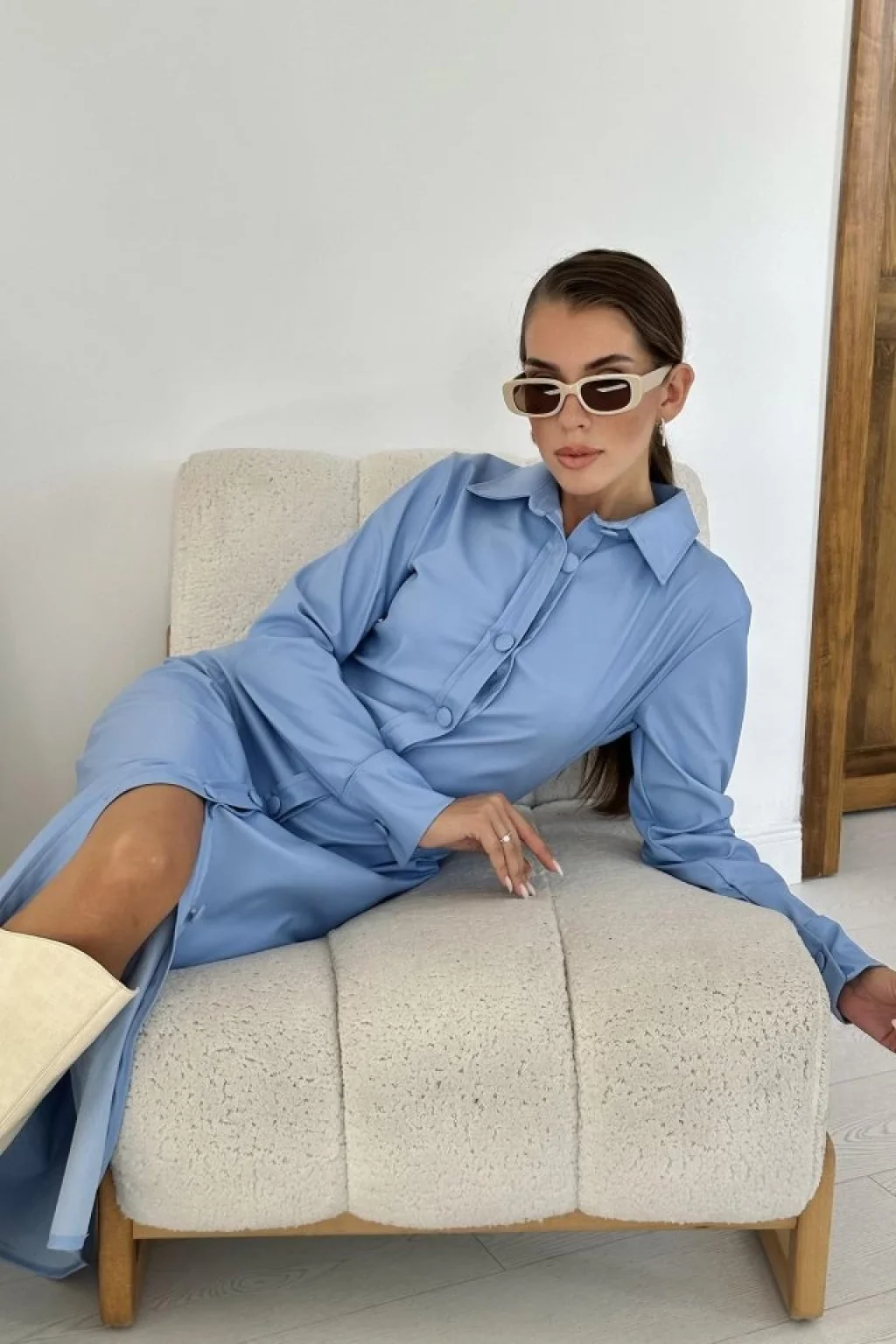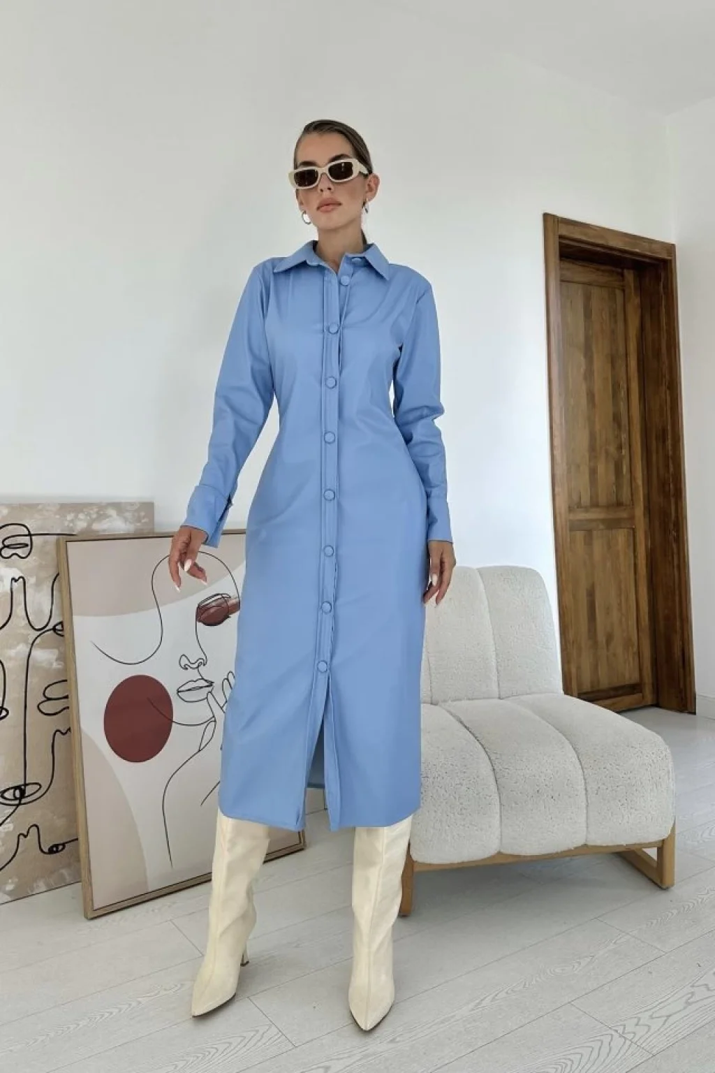 Mavi Boydan Düğmeli Deri Elbise