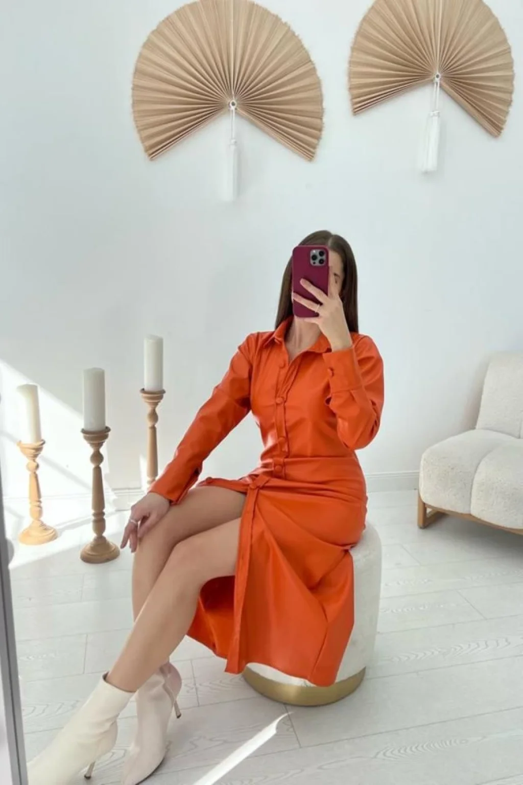 Oranj Boydan Düğmeli Deri Elbise