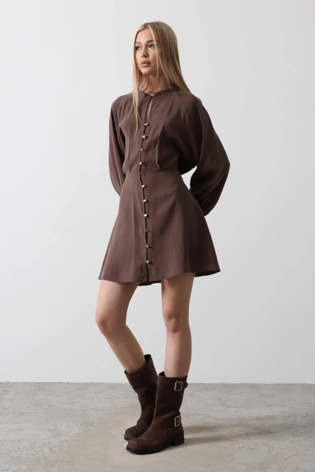 Gold Rengi Düğme Detaylı Elbise - Kahve