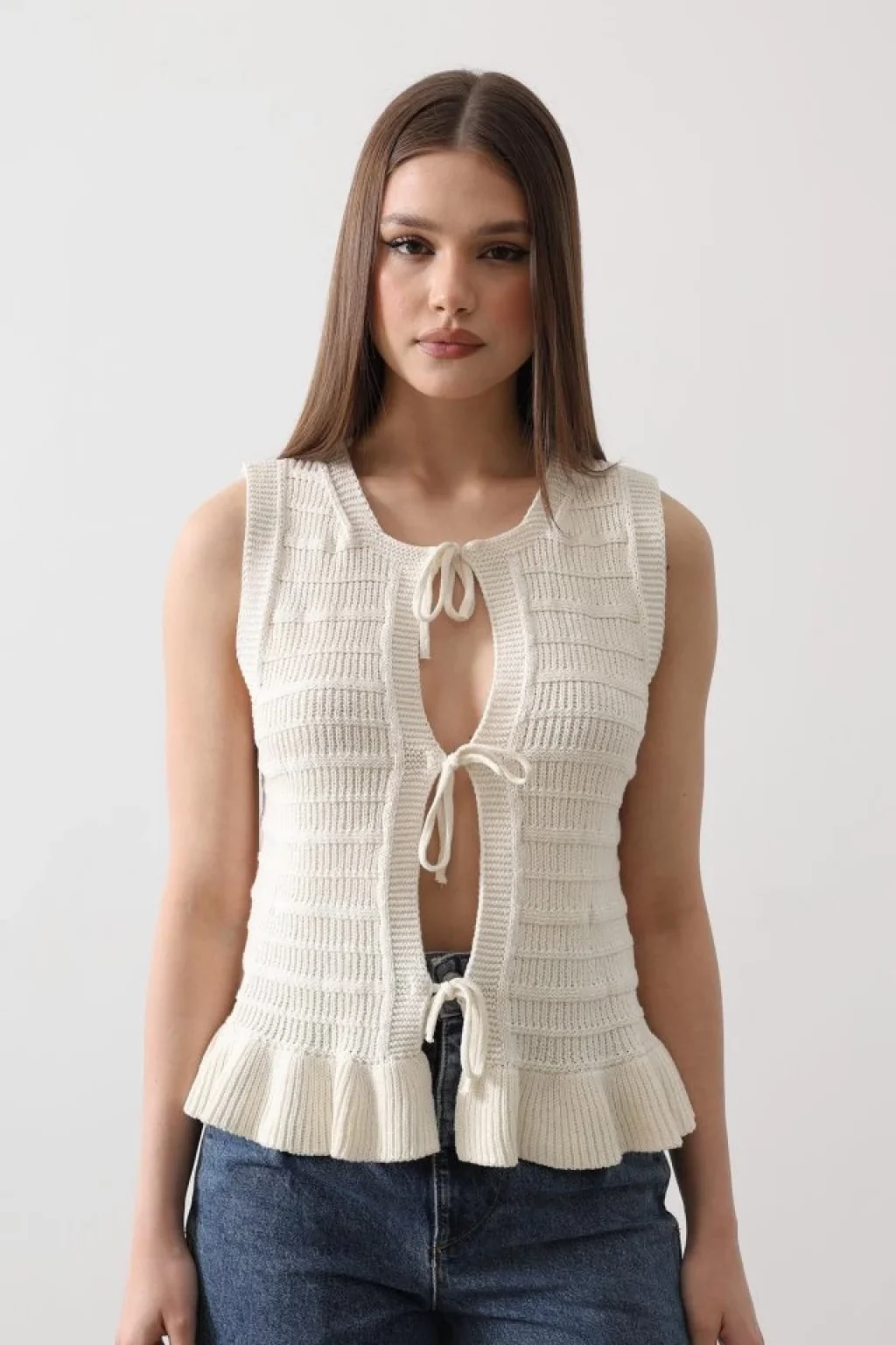 <p>Önü Bağlamalı Yelek - Ekru</p><br> <p>Modelin Ölçüleri: Boy:165, Kg:55, Göğüs:90, Bel:72, Kalça: 100</p><br> <p>Modelin üzerindeki ürün M/38 bedendir</p><br> <ul> </ul>