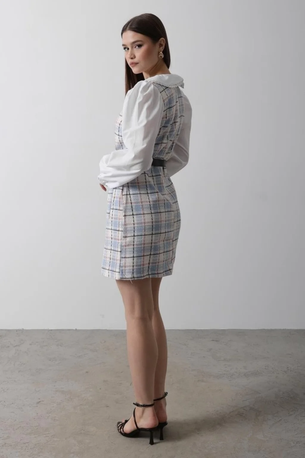 Ekoseli Gömlek Detaylı Elbise - Mavi