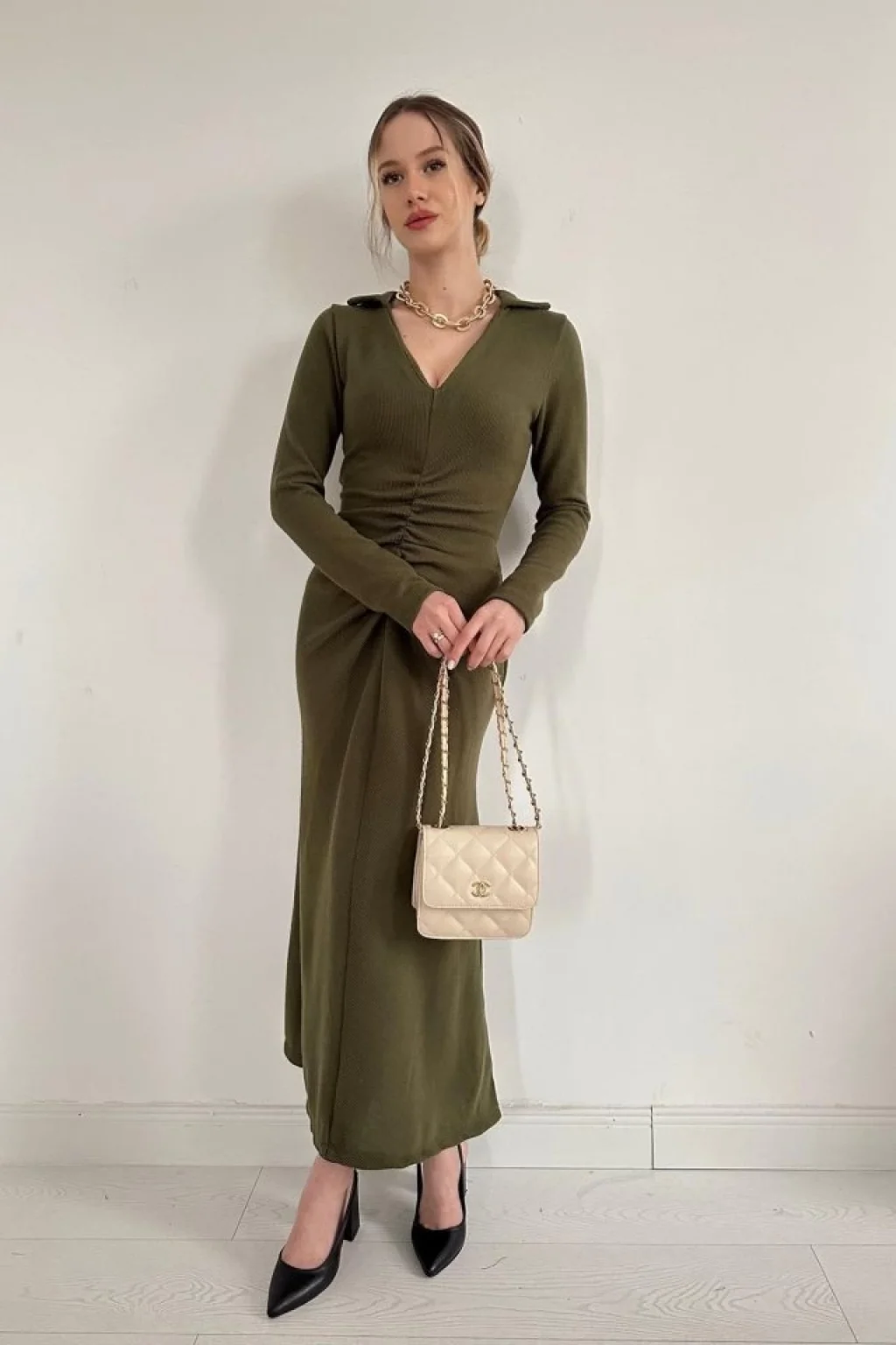 Haki Büzgülü Triko Balık Elbise