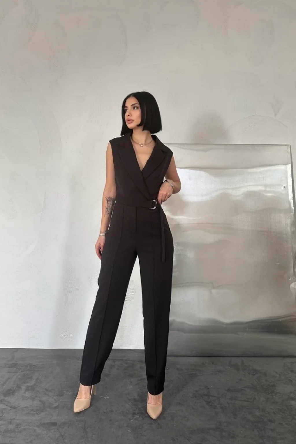 Kadın Uzun Kollu Kruvaze Yakalı Kolları Tül Detay Beli Kuşaklı Ithal Krep Tulum