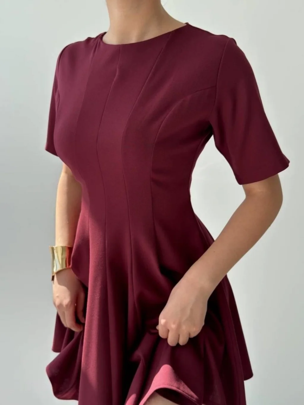 Kadın Uzun Kollu Yuvarlak Yaka Etek Ucu şerit Detaylı Mini Dokuma Elbise