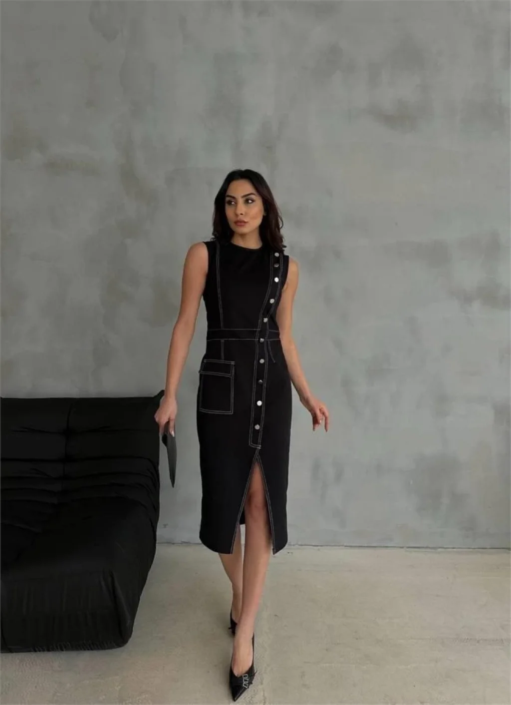 Kadın Uzun Kollu Geometrik Yaka Midi Ithal Krep Elbise