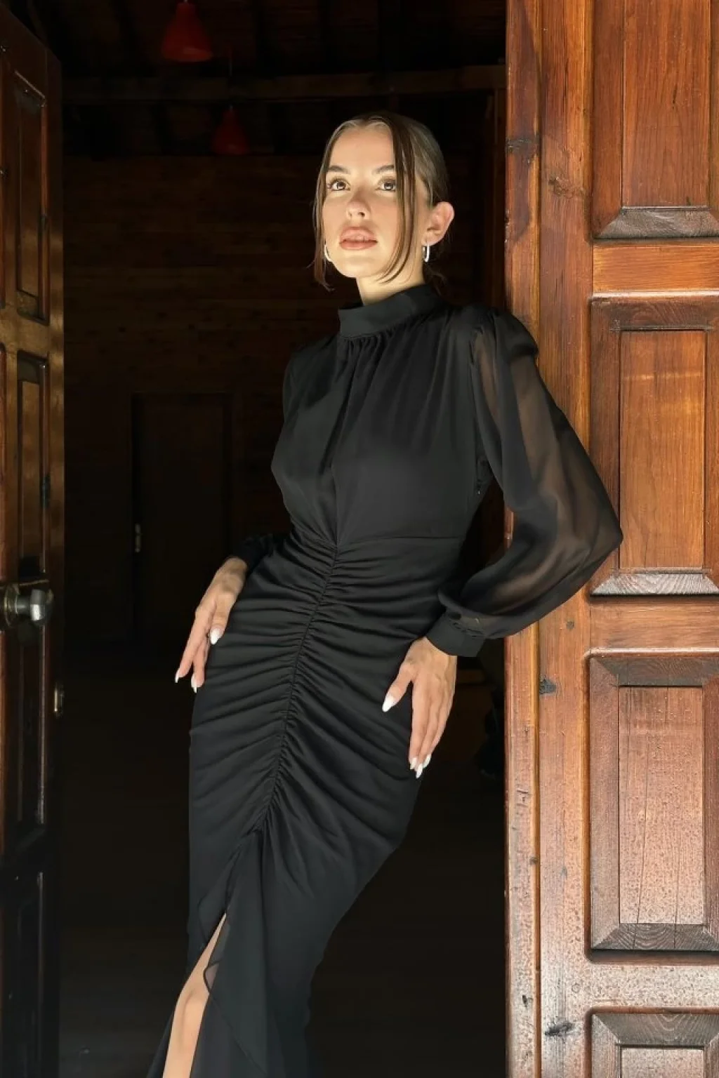 <p>Siyah Önü Büzgülü Şifon Elbise</p><br> <p>Modelin Ölçüleri: Boy:165, Kg:55, Göğüs:90, Bel:72, Kalça: 100</p><br> <p>Modelin üzerindeki ürün M/38 bedendir</p><br> <ul> </ul>