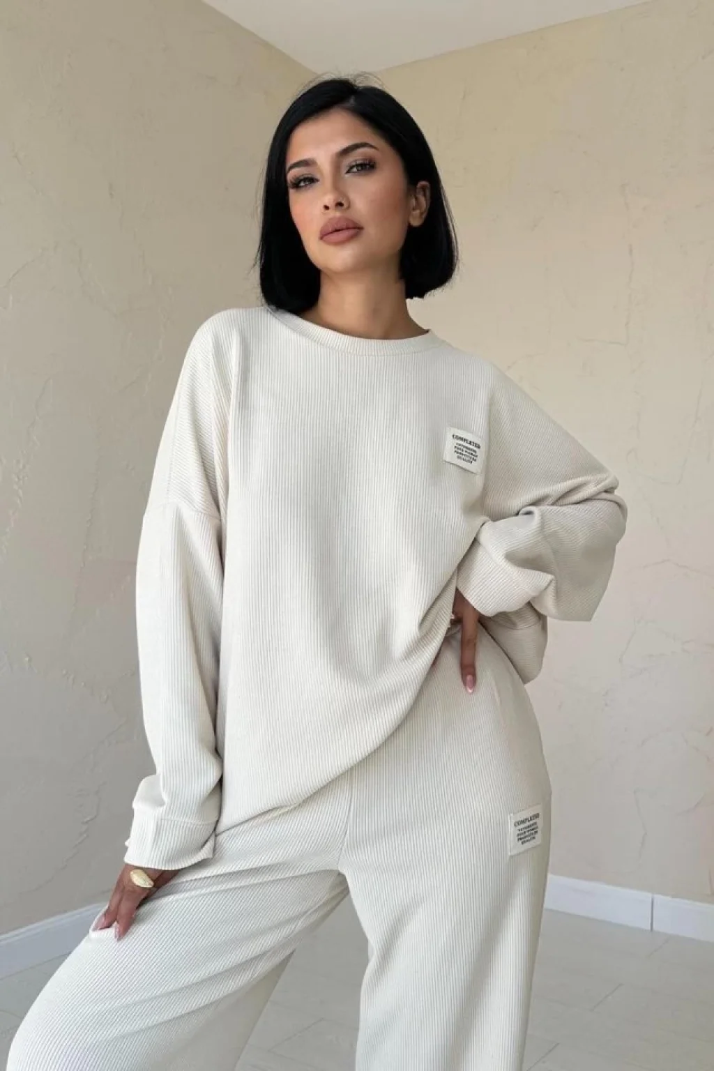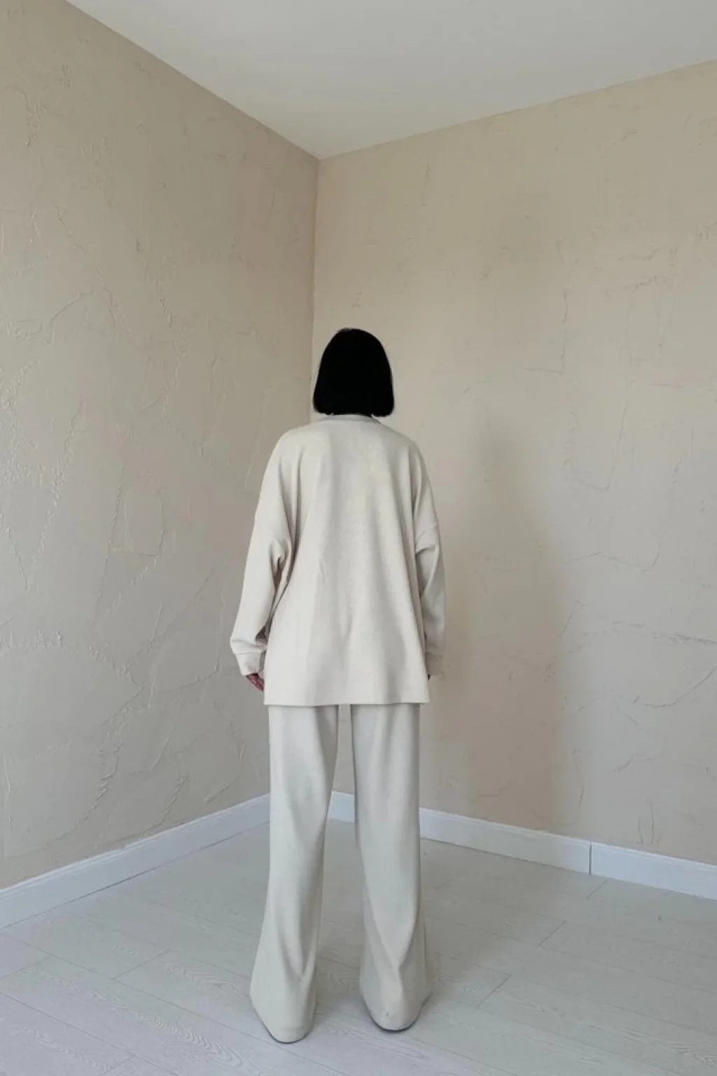 Bej Klasik Fitilli Kazak Ve Pantolon Takım
