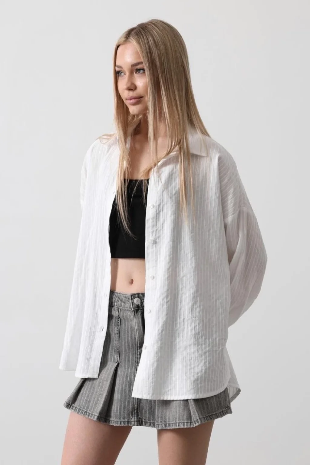 <p>Çizgili Uzun Kol Gömlek - Beyaz</p><br> <p>Modelin Ölçüleri: Boy:165, Kg:55, Göğüs:90, Bel:72, Kalça: 100</p><br> <p>Modelin üzerindeki ürün M/38 bedendir</p><br> <ul> </ul>