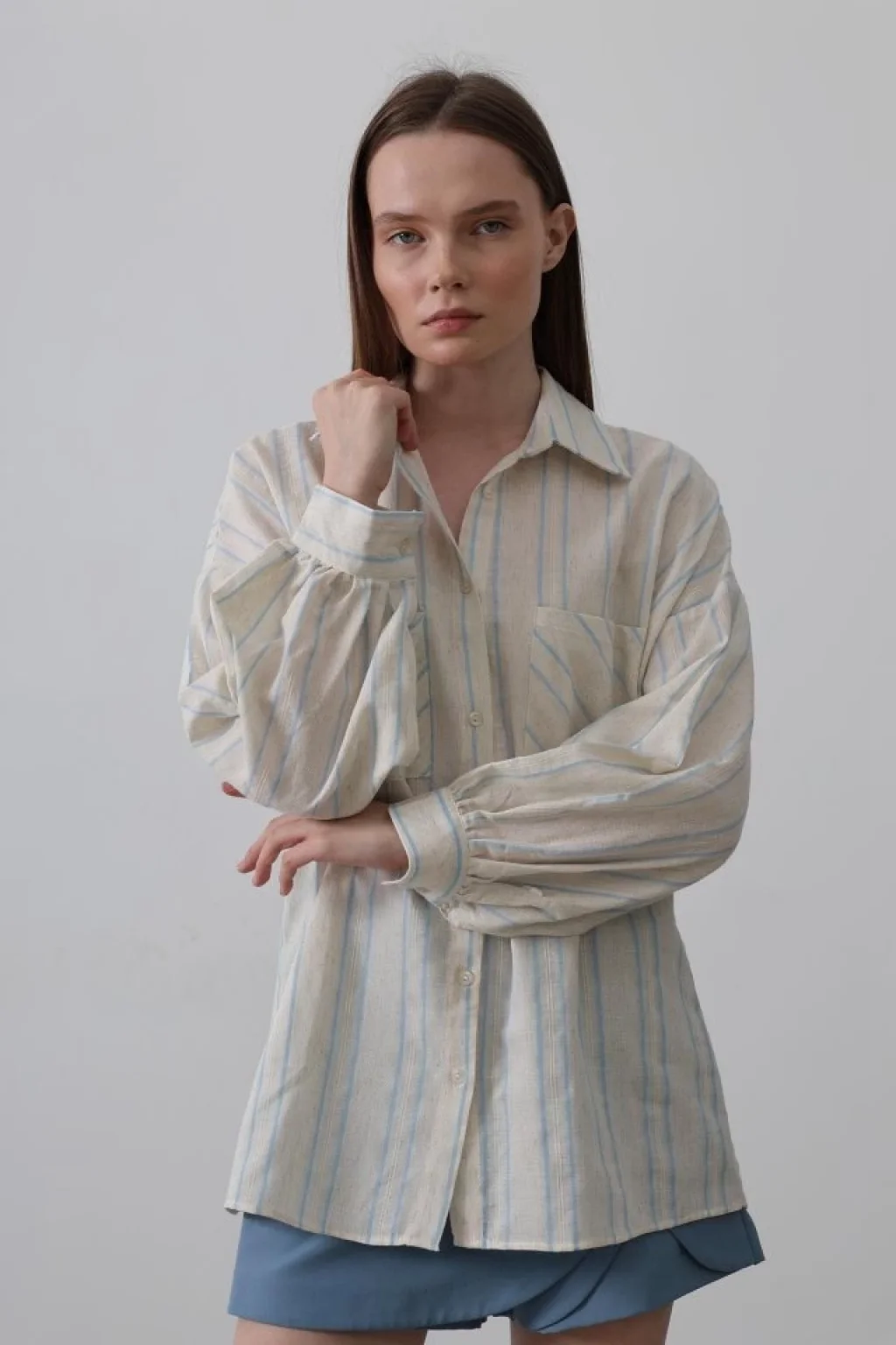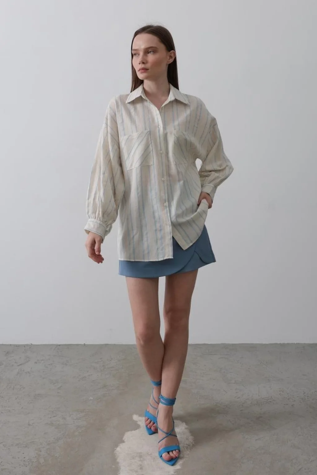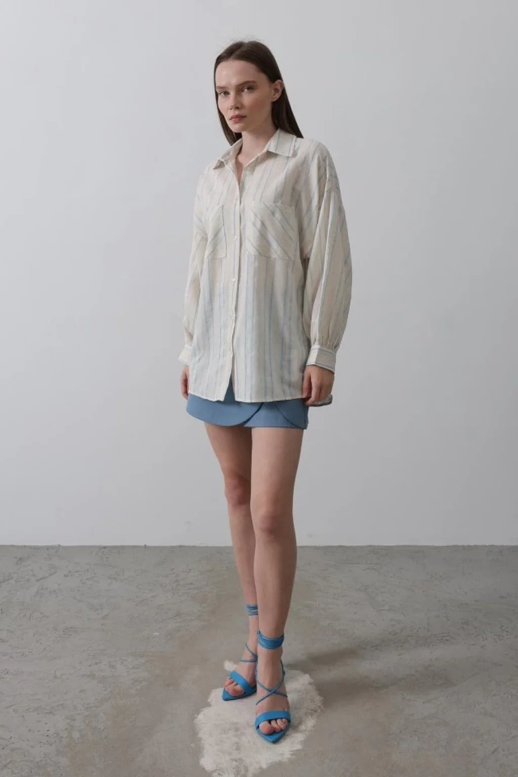<p>Gömlek - Bej Mavi</p><br> <p>Modelin Ölçüleri: Boy:165, Kg:55, Göğüs:90, Bel:72, Kalça: 100</p><br> <p>Modelin üzerindeki ürün M/38 bedendir</p><br> <ul> </ul>