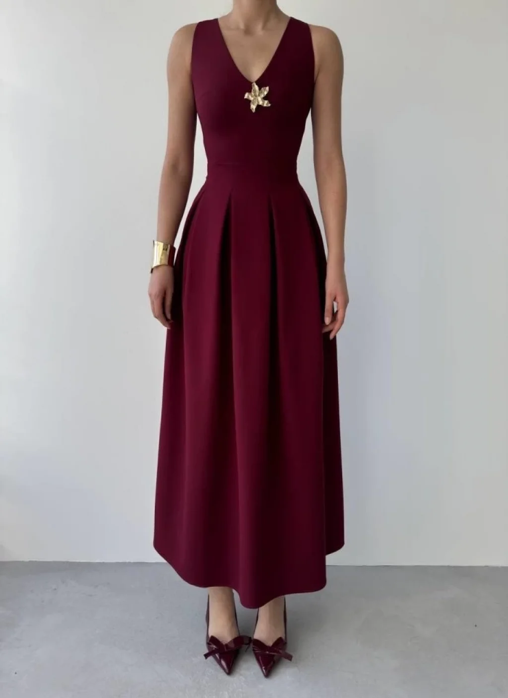 Kadın Uzun Kollu Geometrik Yaka Midi Ithal Krep Elbise