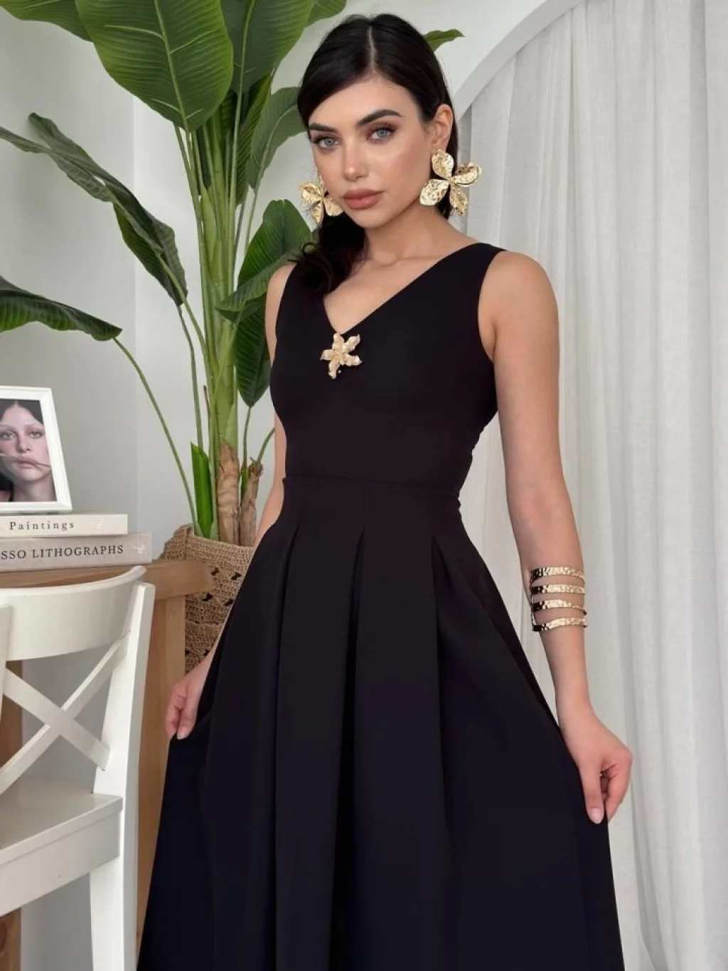 Kadın Uzun Kollu Geometrik Yaka Midi Ithal Krep Elbise