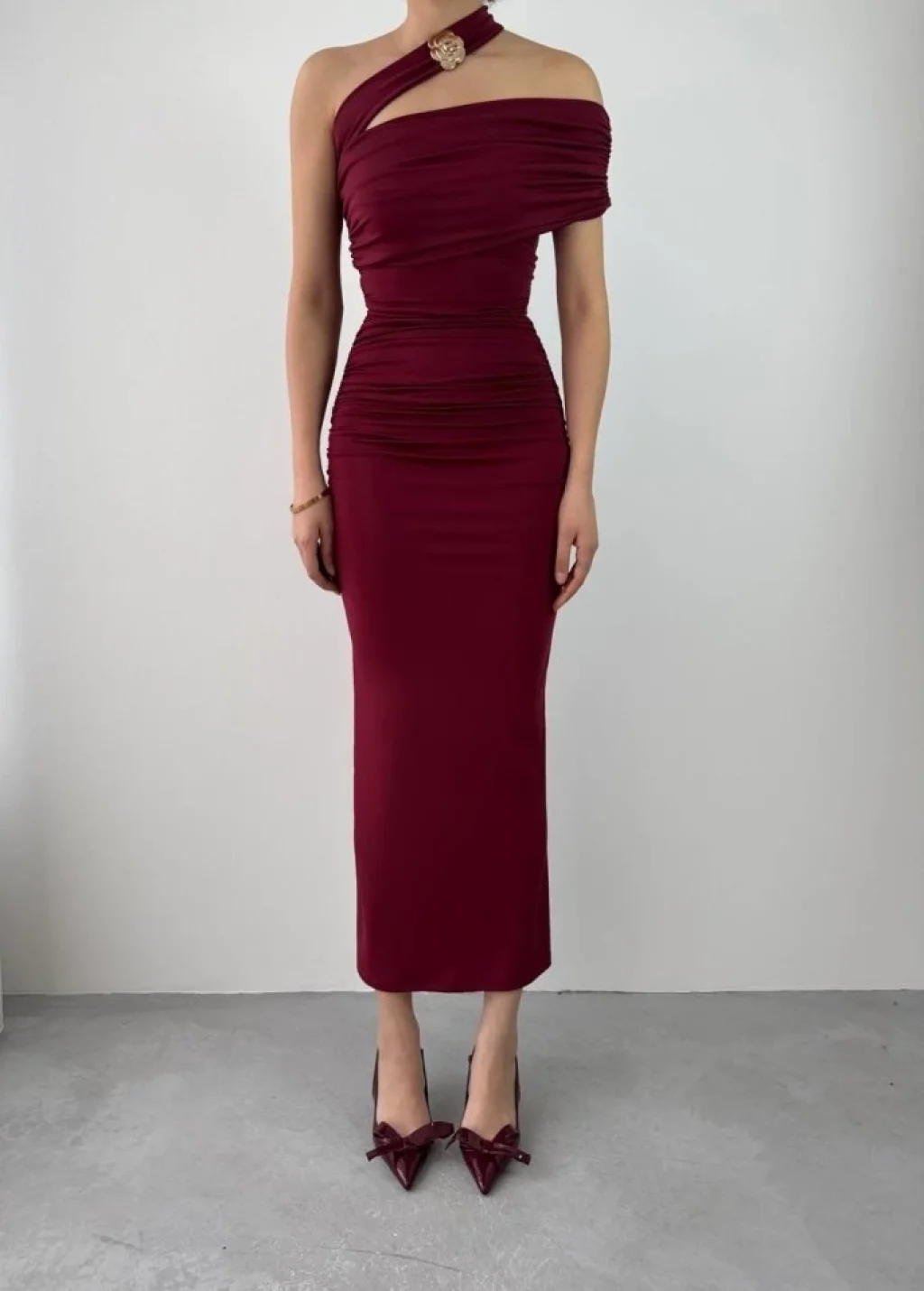 Kadın Uzun Kollu Geometrik Yaka Midi Ithal Krep Elbise