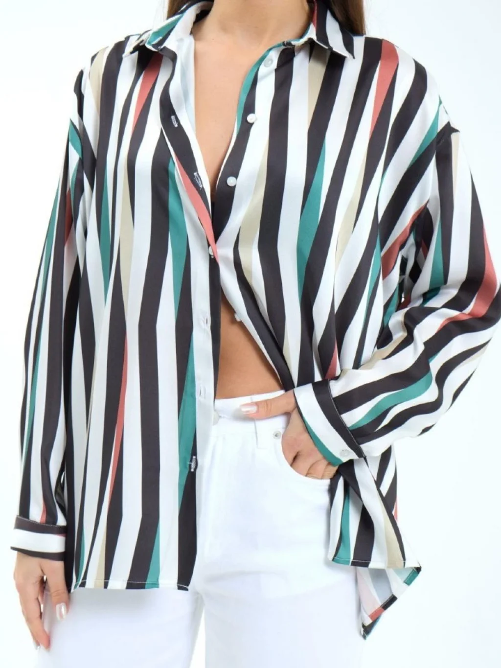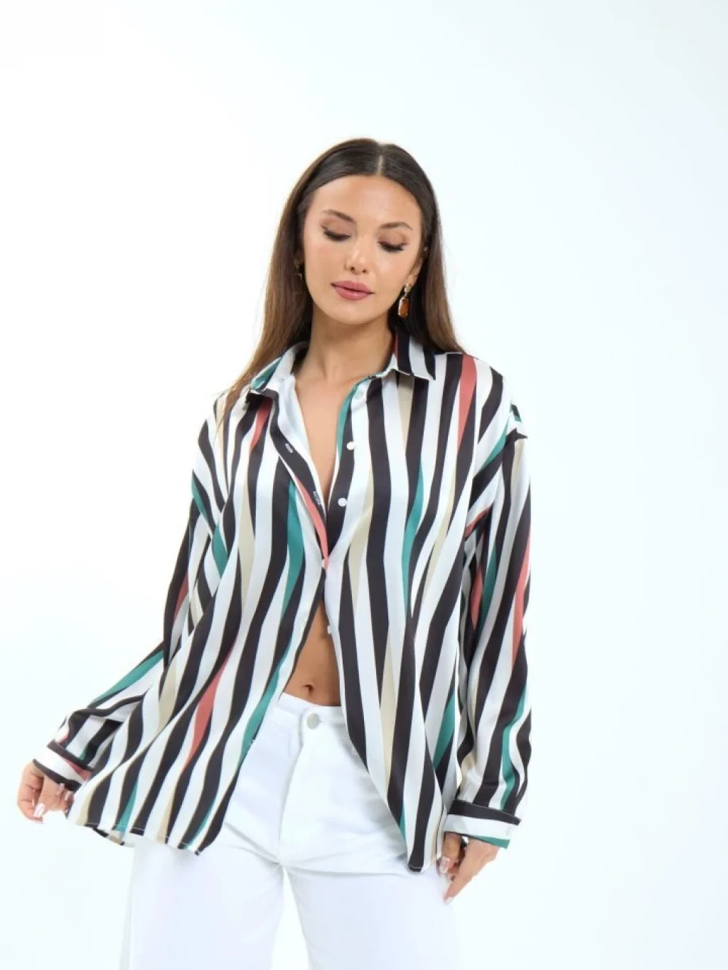 Kadın Uzun Kollu Fırfır Yakalı önden Düğmeli çizgili Burgu Gömlek