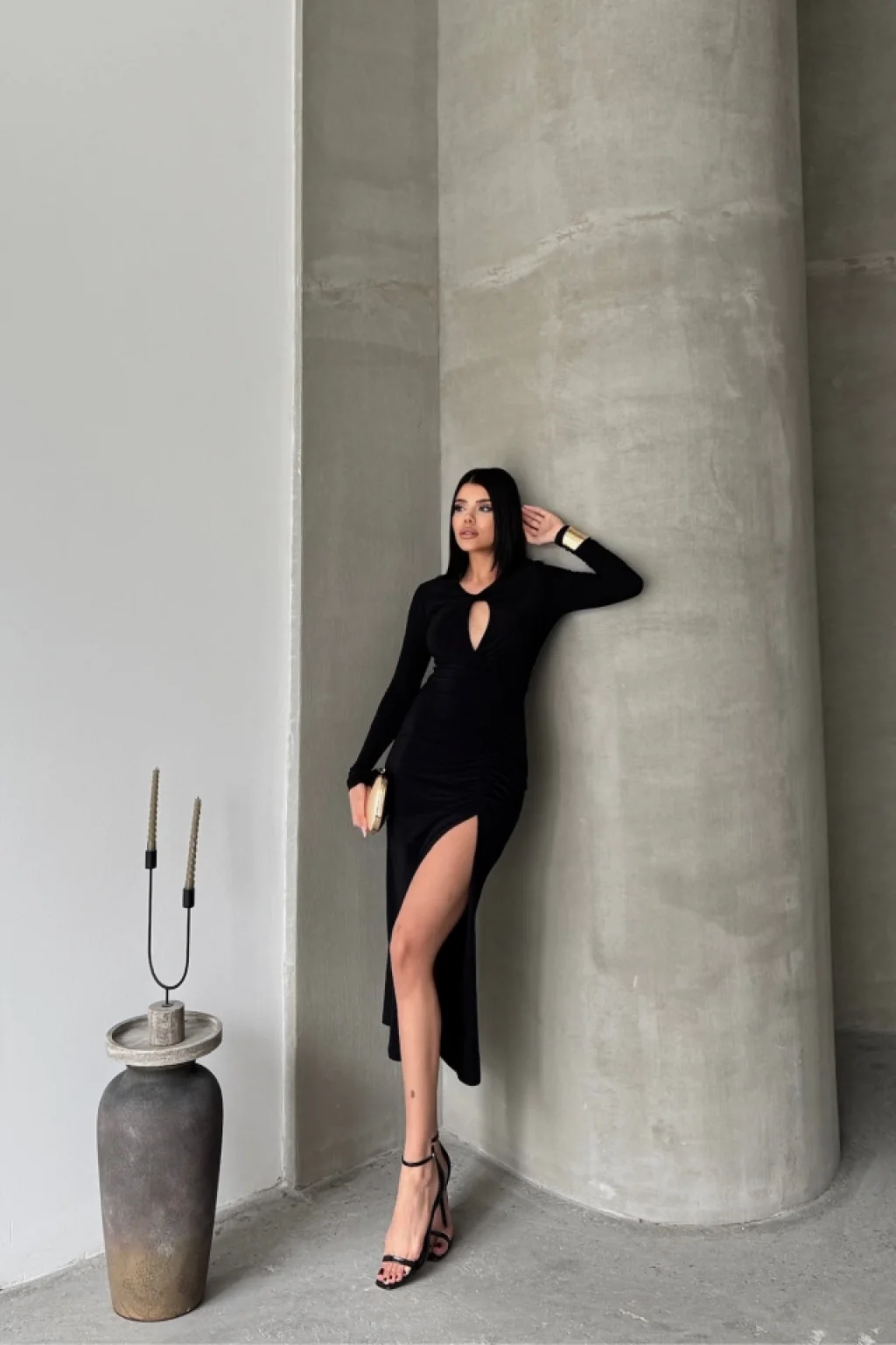 Kadın Uzun Kollu Bisiklet Yaka Yandan Yırtmaçlı Midi Triko Elbise