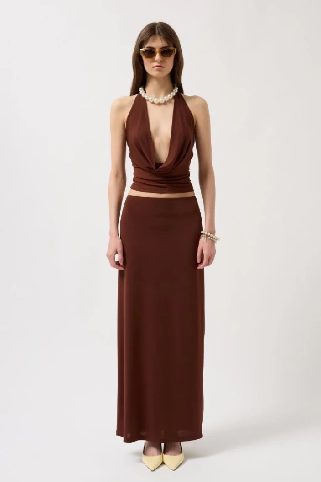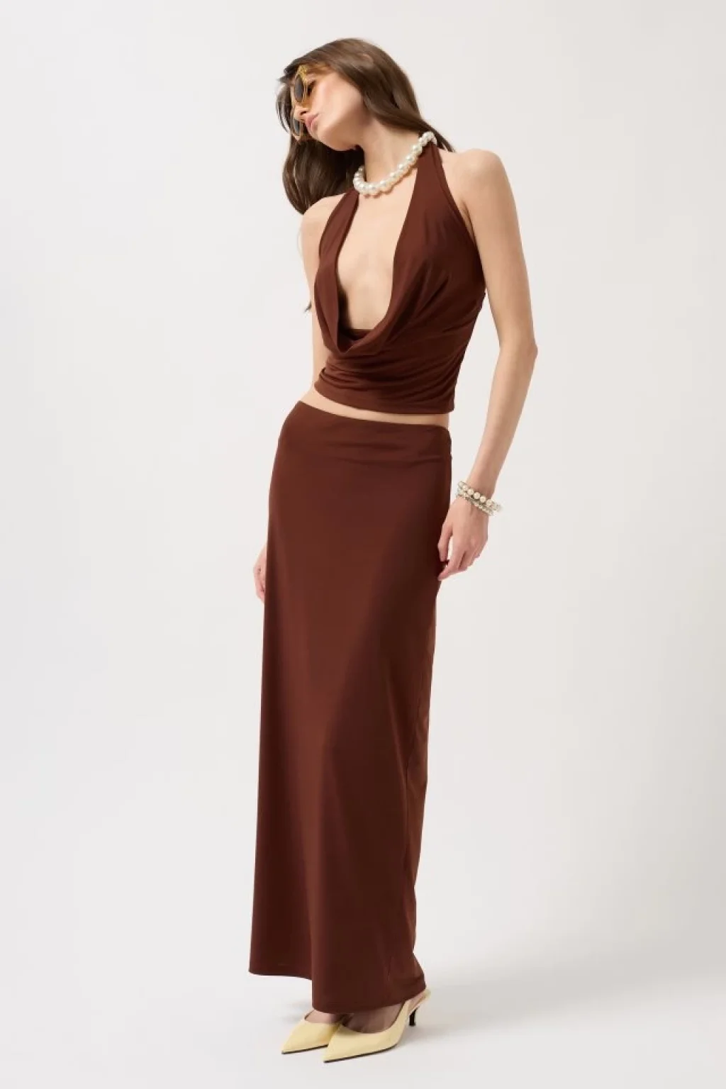 Kadın Yüksek Belli Maxi Deri Kemersiz Etek