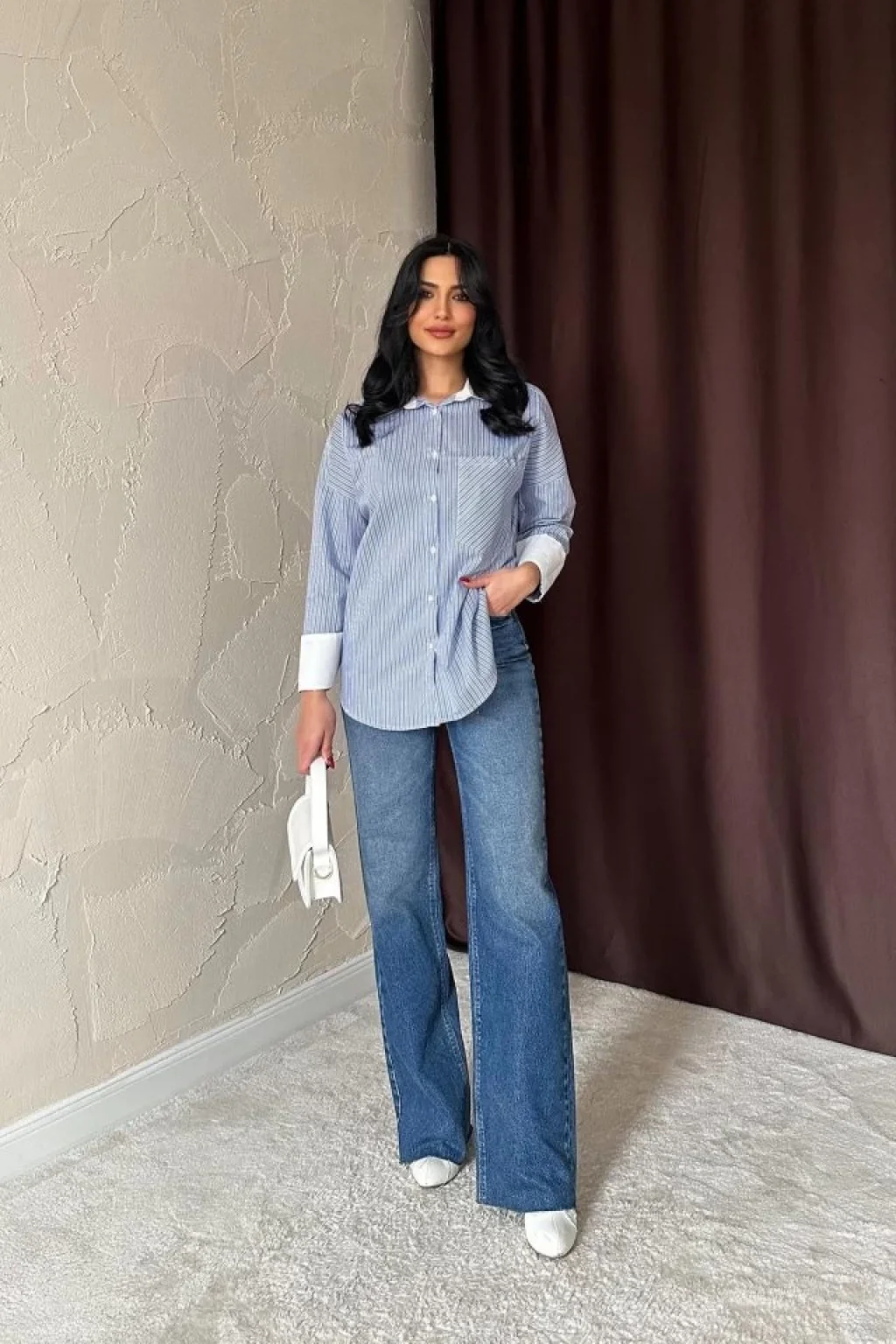 <p>Mavi Çizgili Poplin Uzun Kol Gömlek</p><br> <p>Modelin Ölçüleri: Boy:165, Kg:55, Göğüs:90, Bel:72, Kalça: 100</p><br> <p>Modelin üzerindeki ürün M/38 bedendir</p><br> <ul> </ul>